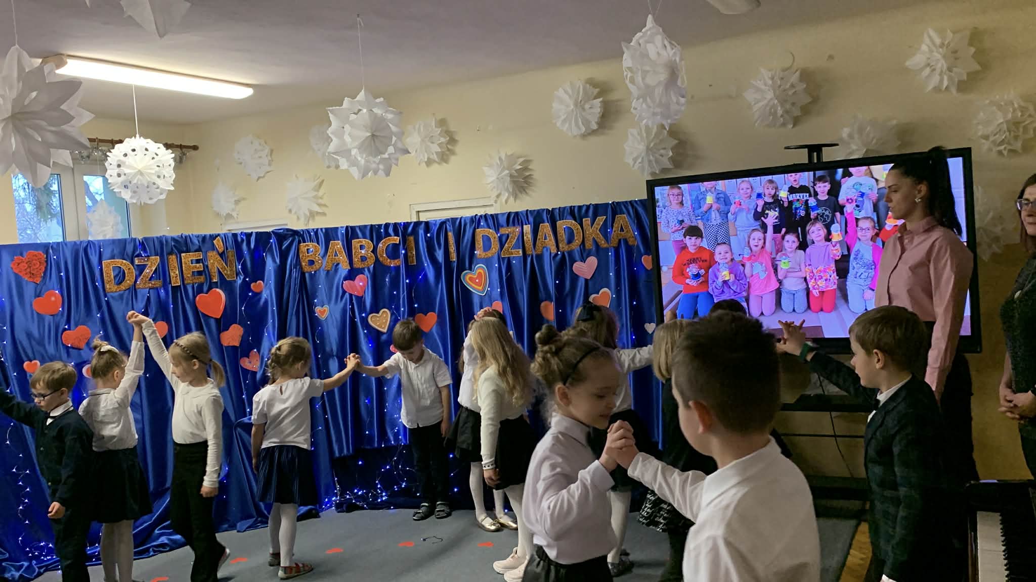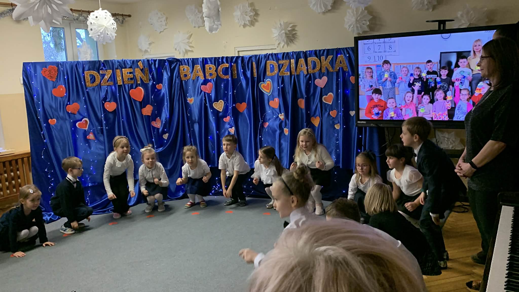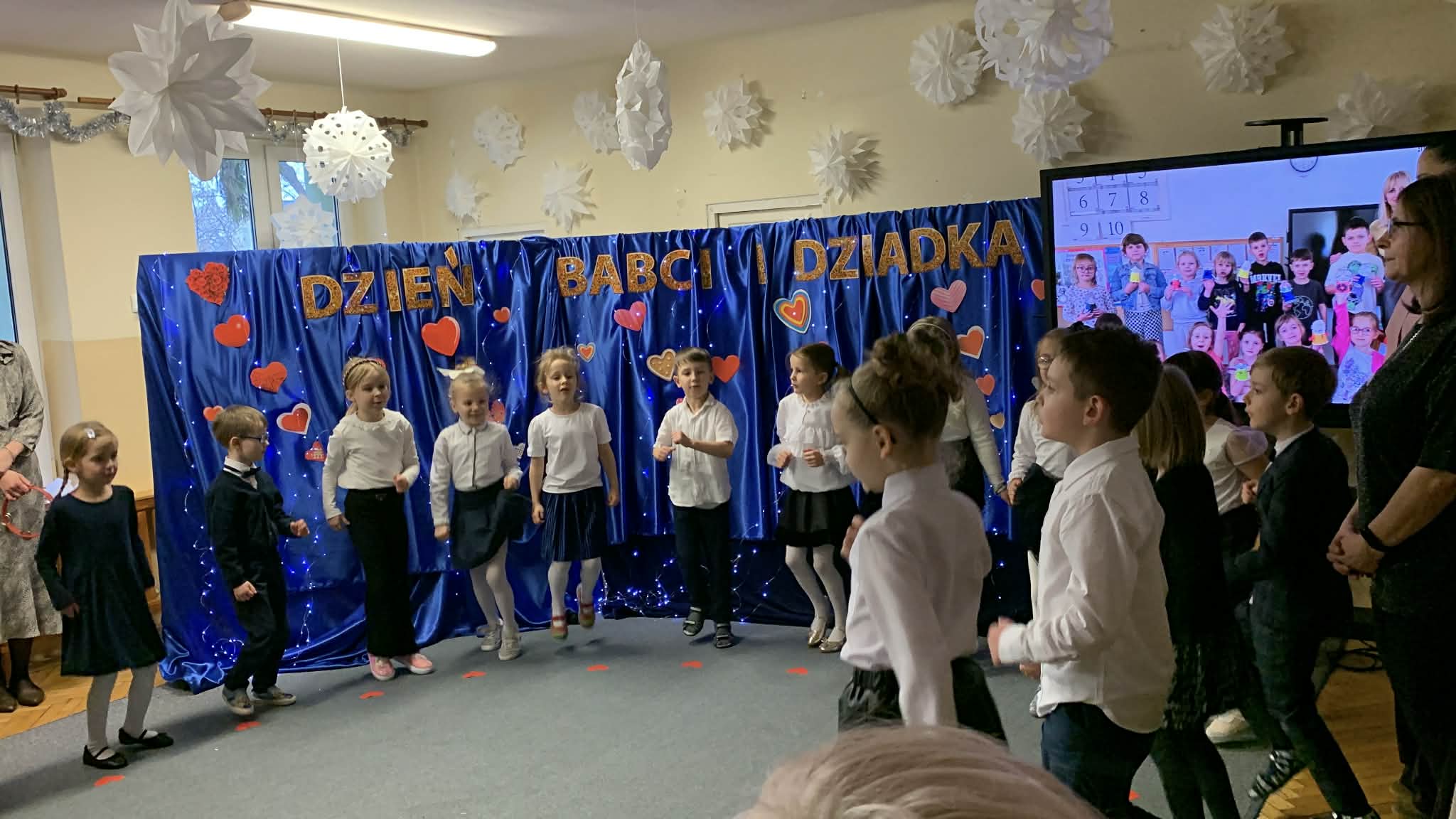 Dzisiejszy dzień w naszym przedszkolu był wypełniony wzruszeniem, uśmiechem i niezwykle ciepłą atmosferą. Gościliśmy wyjątkowych gości – nasze kochane Babcie i Dziadków, dla których dzieci przygotowały specjalny program artystyczny. Przedszkolaki z wielkim zaangażowaniem recytowały wierszyki i śpiewały piosenki, dziękując za miłość i cierpliwość. Hitem okazał się również finał – wspólny taniec rock and rolla! Energia na parkiecie pokazała, że radość nie zna wieku, a wspólna zabawa łączy pokolenia najlepiej na świecie.