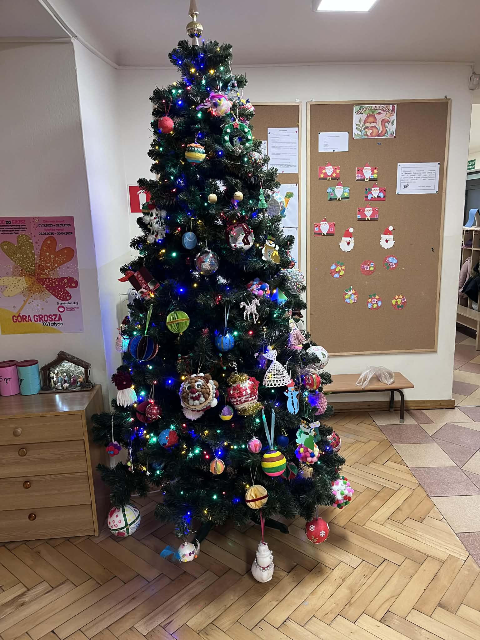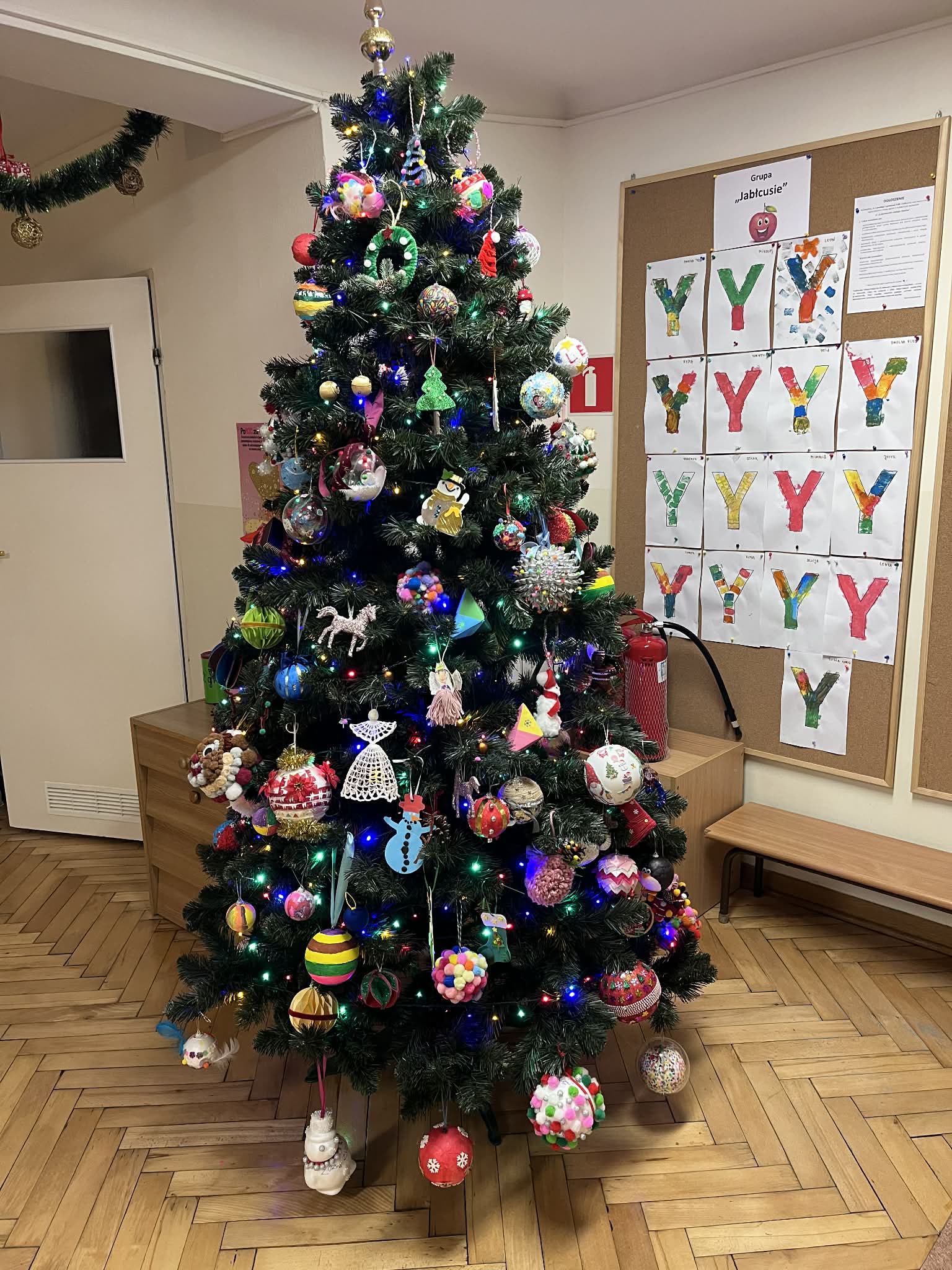 Nasz hol przedszkolny rozbłysnął już świątecznym blaskiem! Stoi w nim choinka, udekorowana wyłącznie unikalnymi ozdobami, które z wielkim zaangażowaniem przygotowały nasze przedszkolaki.