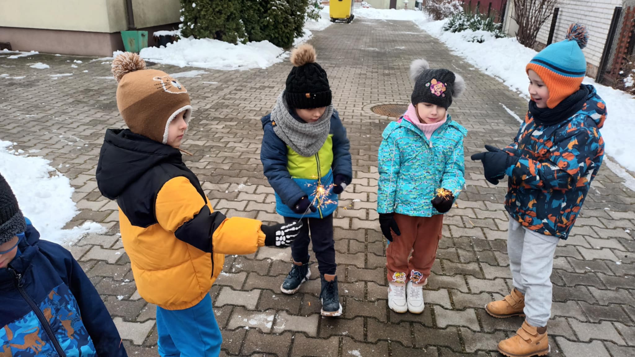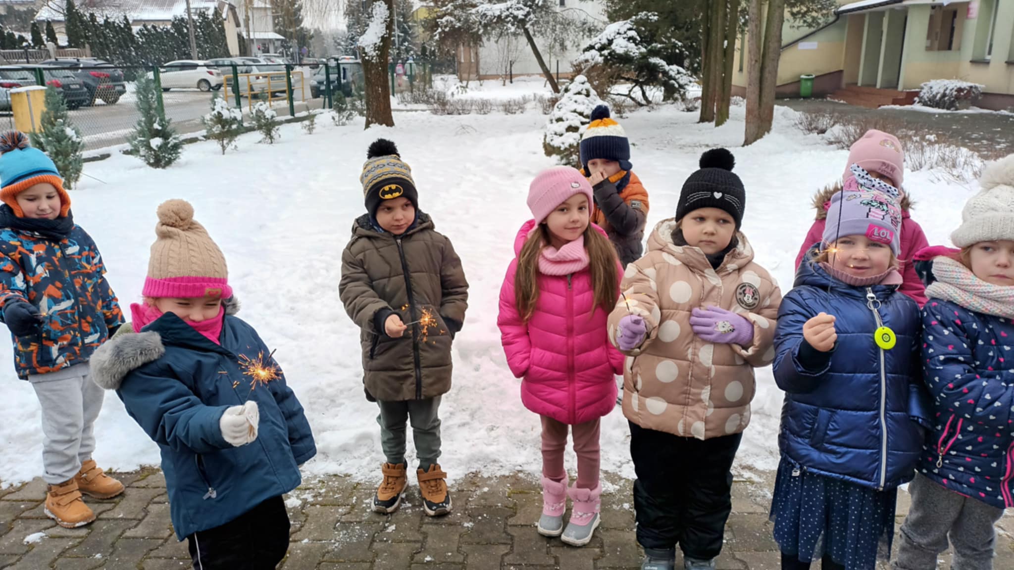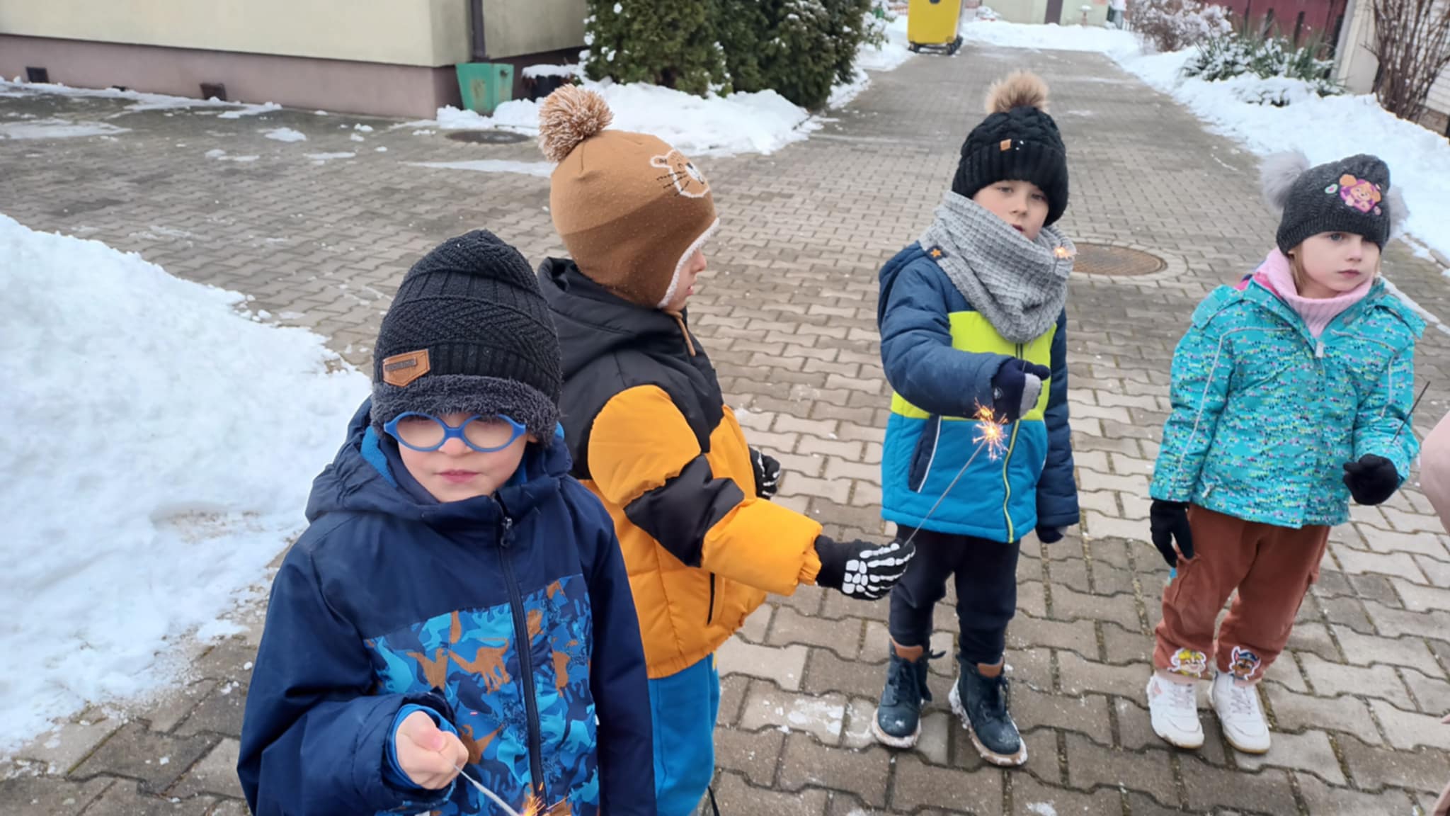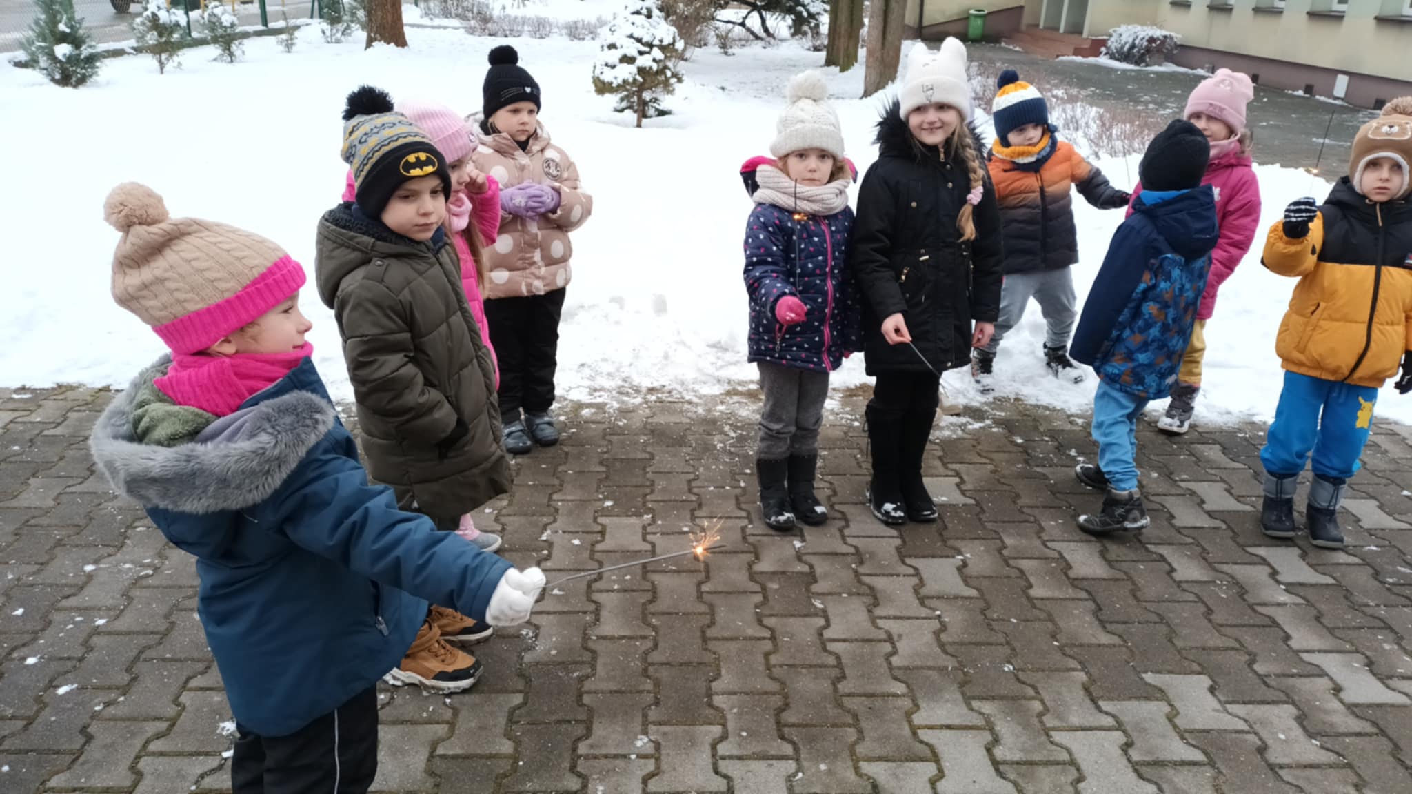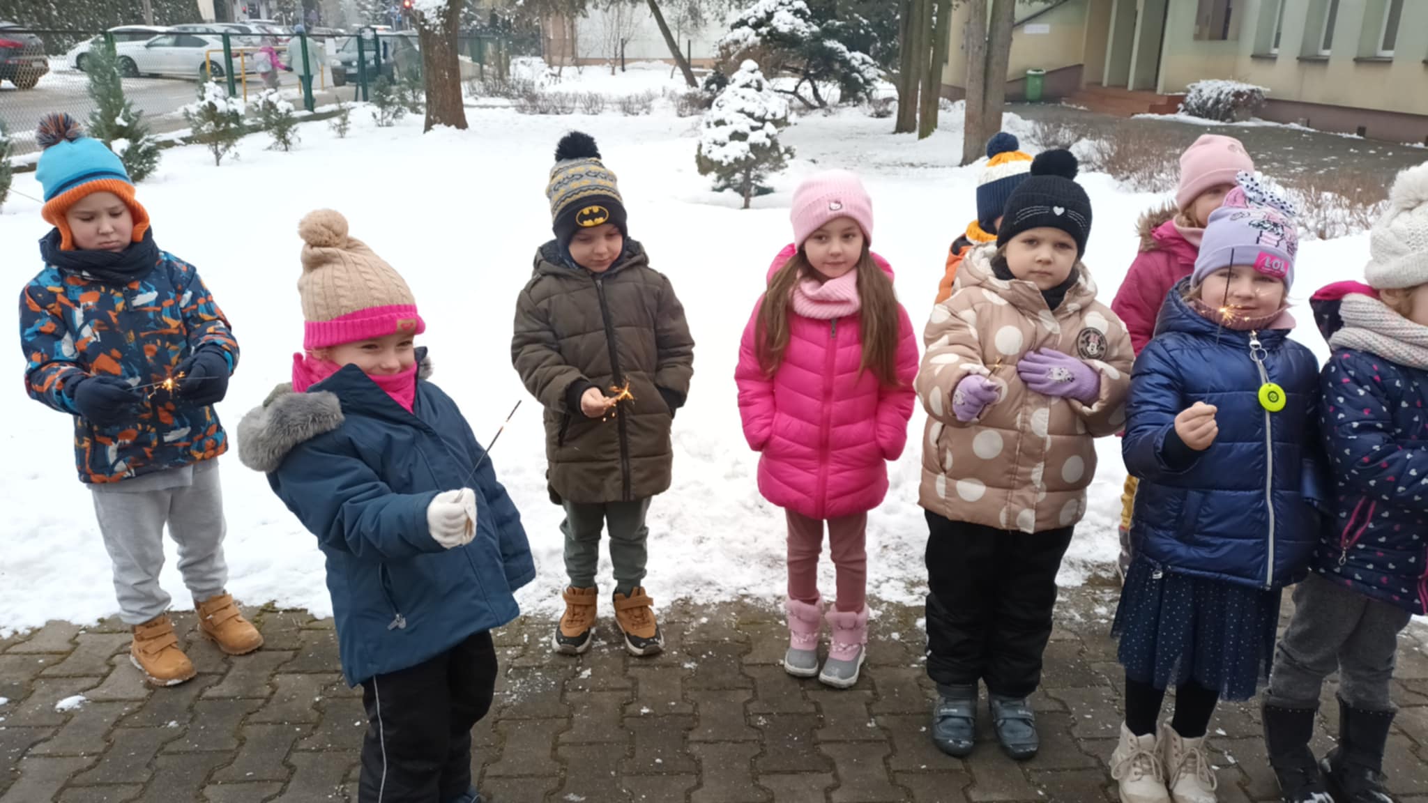 Grupa „Jabłcusie” wykorzystała zimową aurę na aktywny spacer w przedszkolnym ogrodzie. Głównym celem wyjścia było hartowanie organizmów oraz rozwijanie sprawności ruchowej podczas radosnych zabaw na śniegu i bitwy na śnieżki. Dzieci zamieniły się w małych obserwatorów przyrody – badały właściwości lodu i śniegu oraz przyglądały się uśpionym drzewom i soplom. Wyjątkowym zwieńczeniem spaceru był pokaz zimnych ogni, który dostarczył przedszkolakom mnóstwo radości. Takie spotkania z naturą to dla naszych podopiecznych najlepsza lekcja hartu ducha i zdrowia!