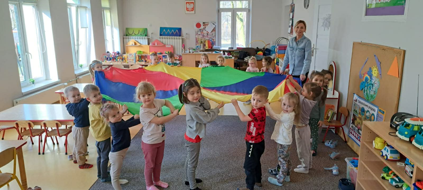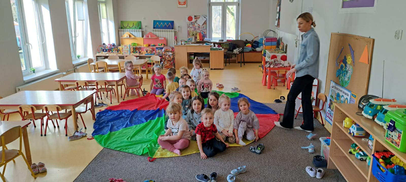 W grupie Bystrzaki odbyły się radosne zabawy z wykorzystaniem kolorowej chusty animacyjnej pod hasłem „Raz słońce, raz deszcz”. Dzieci z dużym zaangażowaniem uczestniczyły w aktywnościach ruchowych, które dostarczyły im wiele radości i uśmiechu. To był czas pełen ruchu, śmiechu i dobrej energii!