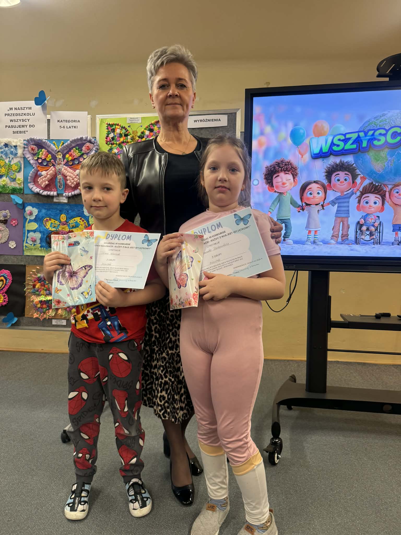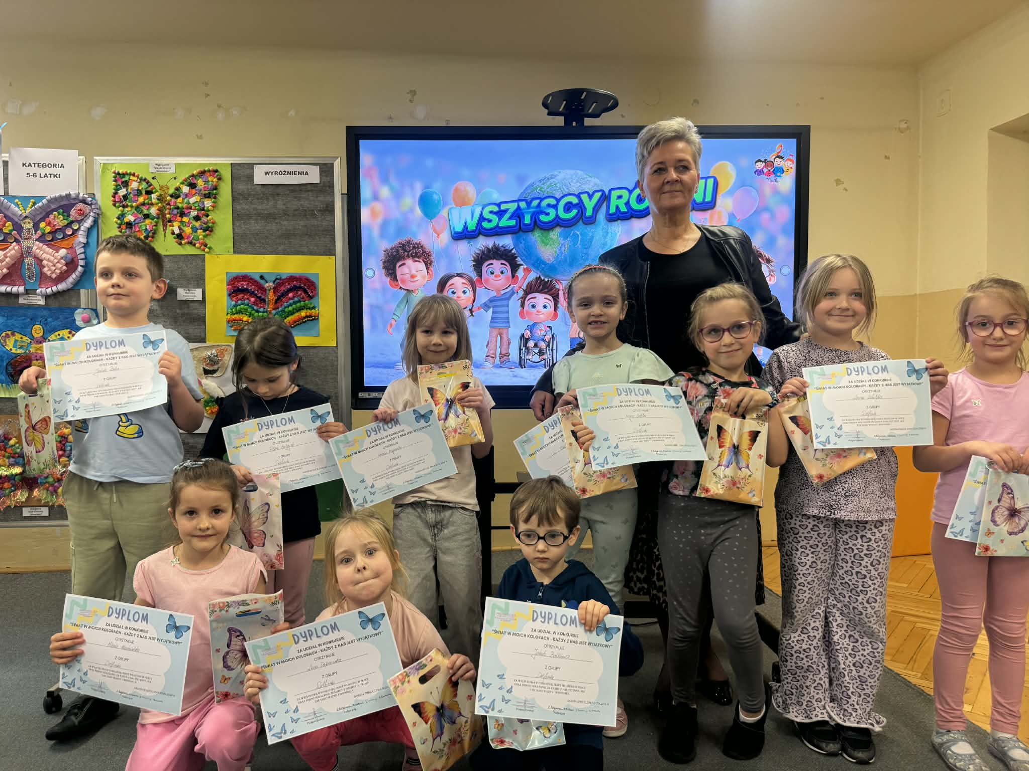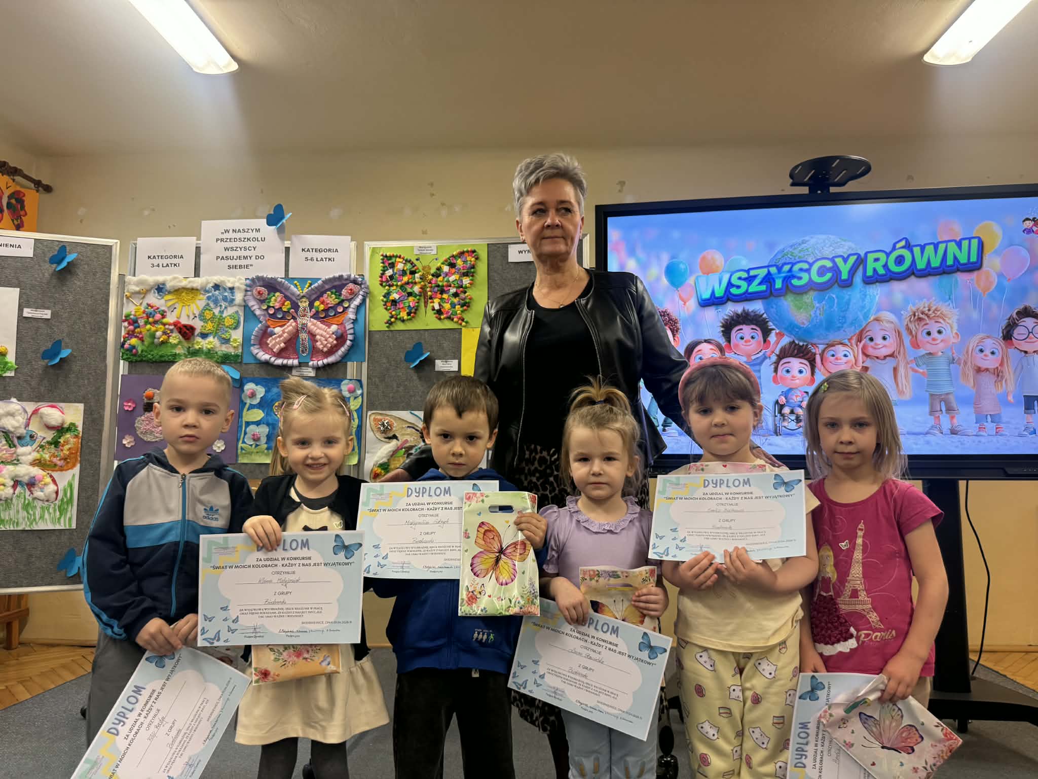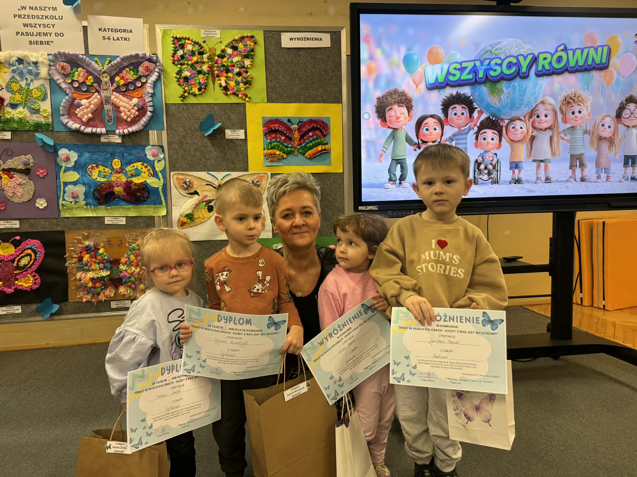 Wszystkie konkursowe dzieła ozdobiły naszą salę gimnastyczną, tworząc tam niezwykłą, kolorową galerię. Ta barwna wystawa nie tylko stroi nasze przedszkole, ale przede wszystkim przypomina nam o tym, jak ważne są akceptacja i zrozumienie. Serdecznie gratulujemy wszystkim uczestnikom talentu oraz ogromnej wyobraźni, a rodzicom dziękujemy za zaangażowanie w tę piękną inicjatywę.