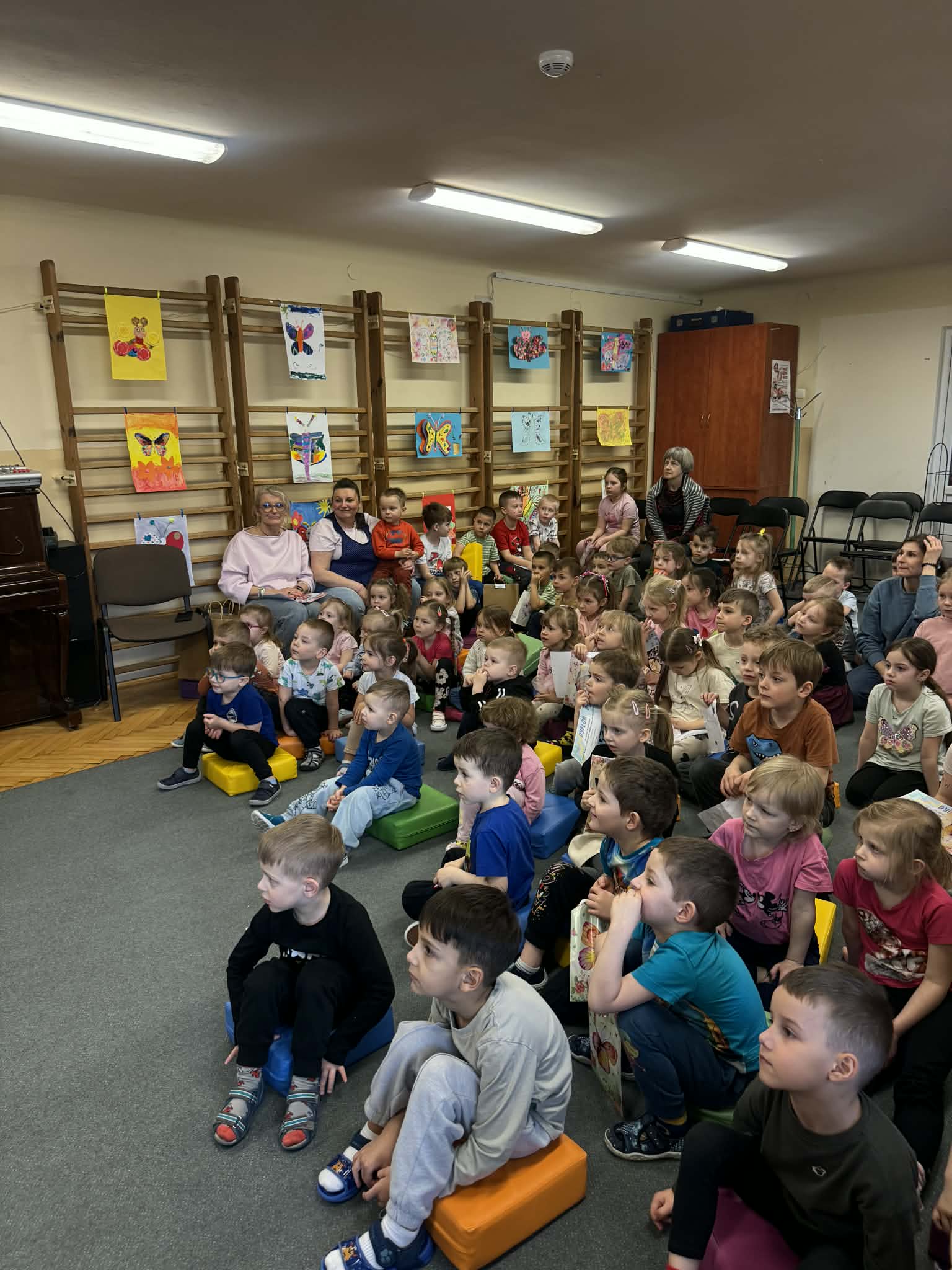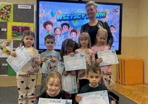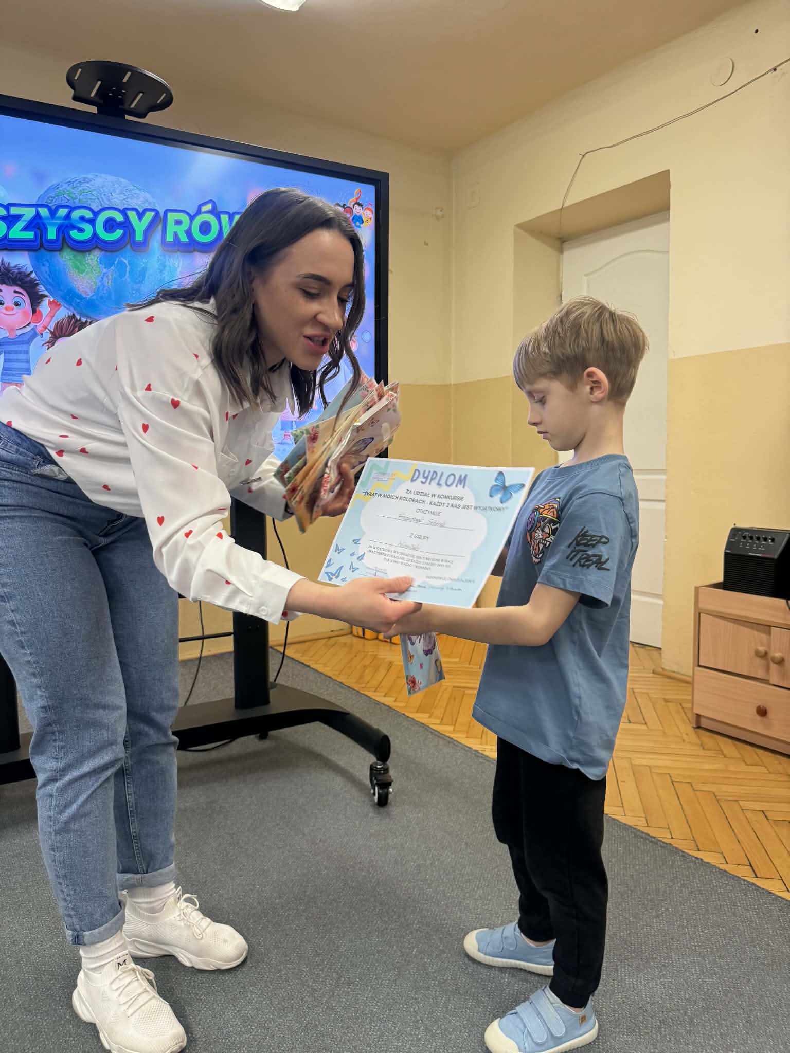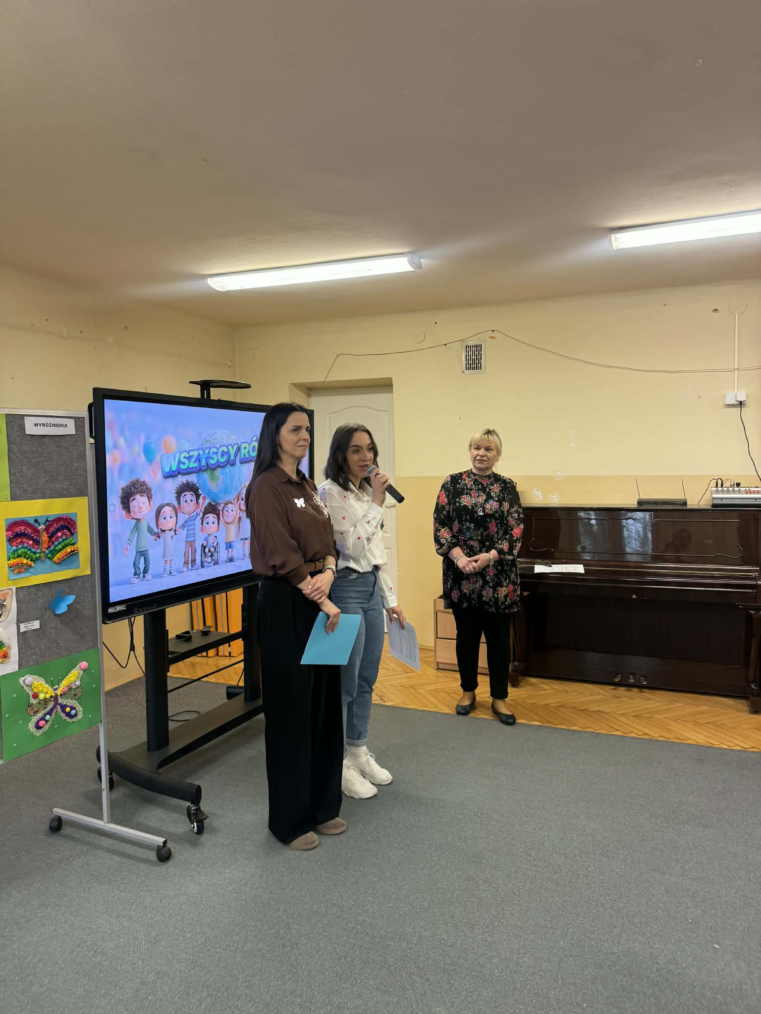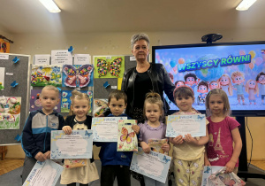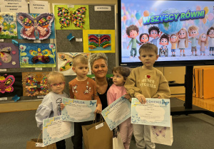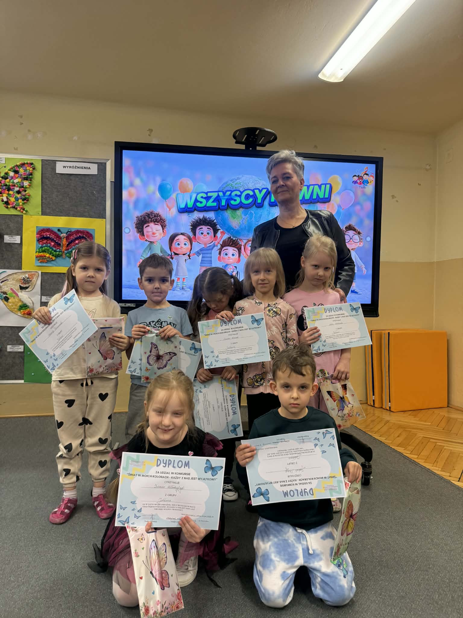 Wszystkie konkursowe dzieła ozdobiły naszą salę gimnastyczną, tworząc tam niezwykłą, kolorową galerię. Ta barwna wystawa nie tylko stroi nasze przedszkole, ale przede wszystkim przypomina nam o tym, jak ważne są akceptacja i zrozumienie. Serdecznie gratulujemy wszystkim uczestnikom talentu oraz ogromnej wyobraźni, a rodzicom dziękujemy za zaangażowanie w tę piękną inicjatywę.