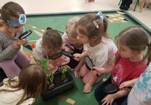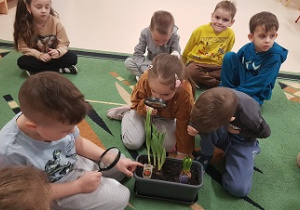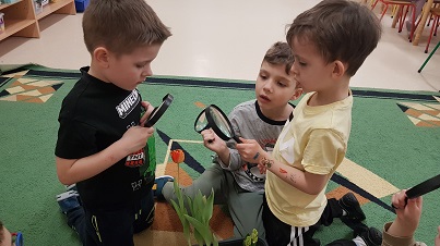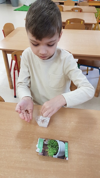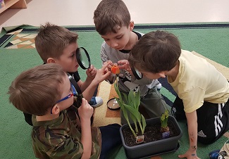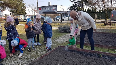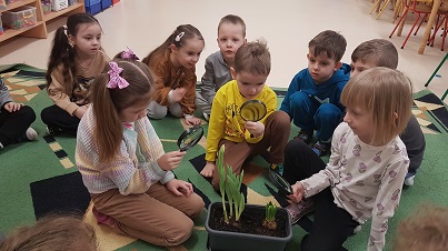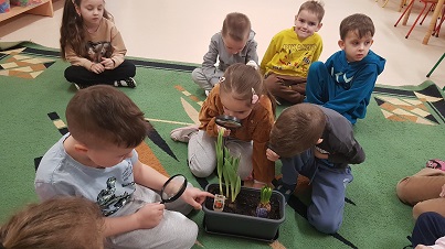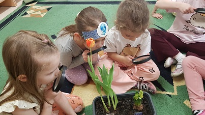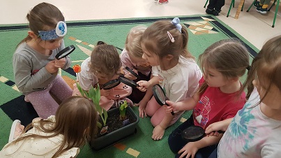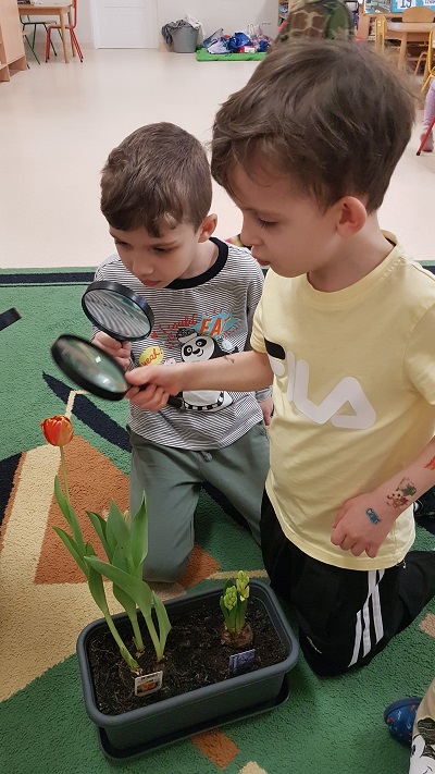 Z wielką radością informujemy, że w marcu rozpoczęliśmy realizację nowej innowacji pedagogicznej. Naszym głównym celem jest rozbudzenie w dzieciach pasji do odkrywania świata natury oraz nauka odpowiedzialności za środowisko poprzez realne działania ogrodnicze. Przygodę zaczęliśmy od wspólnej wycieczki do sklepu ogrodniczego, gdzie dzieci uczyły się, jak profesjonalnie przygotować się do nadchodzącego sezonu. Przedszkolaki poznały niezbędne narzędzia, takie jak szpadle, haczki, grabki czy konewki, a korzystając z książek i broszur, z zaangażowaniem planowały własny ogródek warzywny oraz ziołowy. Podczas rozmów kierowanych mali badacze zastanawiali się, czego rośliny potrzebują do życia, sprawdzając przy tym strukturę gleby i obserwując budzenie się przyrody. W naszych doniczkach oraz na grządkach zagościły już cebula dymka, rzeżucha oraz piękne kwiaty cebulowe, takie jak tulipany i hiacynty. Z zapartym tchem śledzimy teraz rozwój pierwszych pąków i liści.