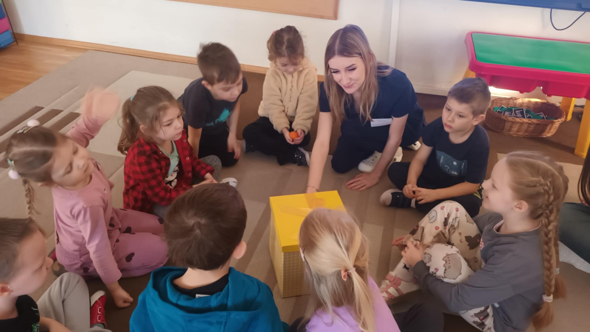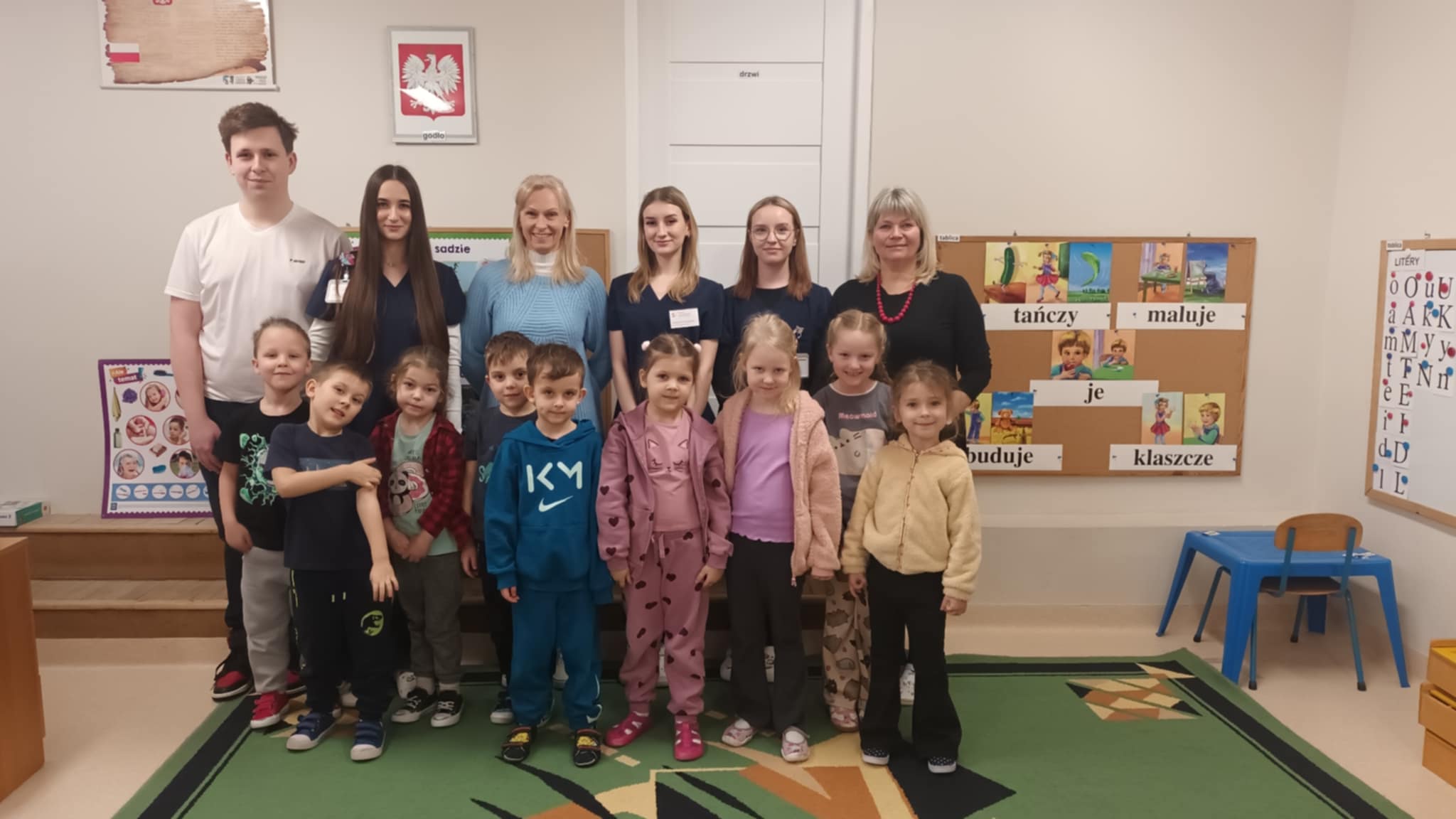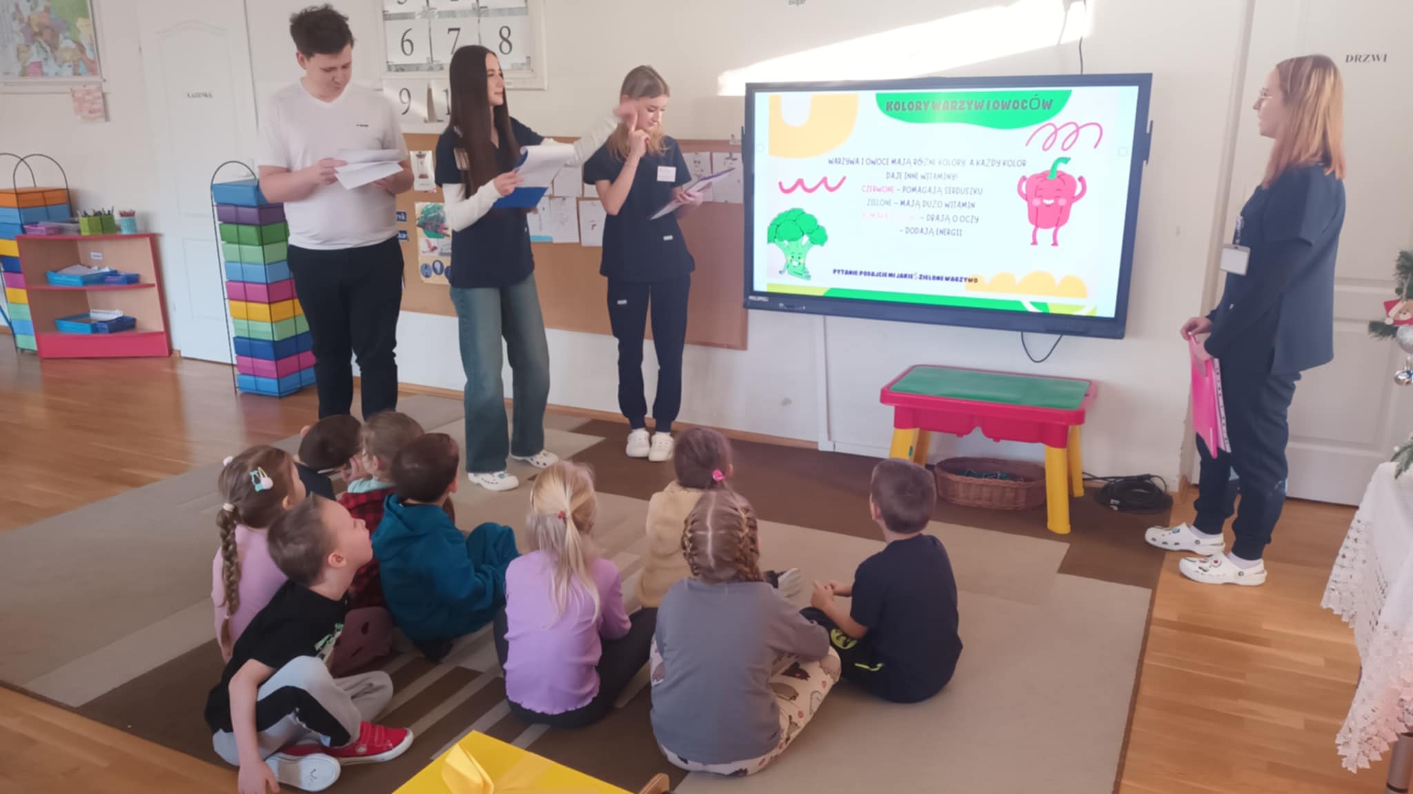 Grupa „Jabłcusie” gościła studentów I roku pielęgniarstwa z Państwowej Akademii Nauk Stosowanych im. Stefana Batorego w Skierniewicach. Przyszli medycy przeprowadzili dla naszych przedszkolaków ciekawe zajęcia pt. „Superbohaterowie na talerzu”. Podczas spotkania studenci wykorzystali prezentację multimedialną, aby w przystępny sposób opowiedzieć o roli witamin w życiu człowieka. Teoria przeplotła się z praktyką – dzięki licznym zabawom i wspólnym rozmowom, dzieci utrwaliły wiedzę o owocach i warzywach, ucząc się, jak dbać o zdrowie każdego dnia.