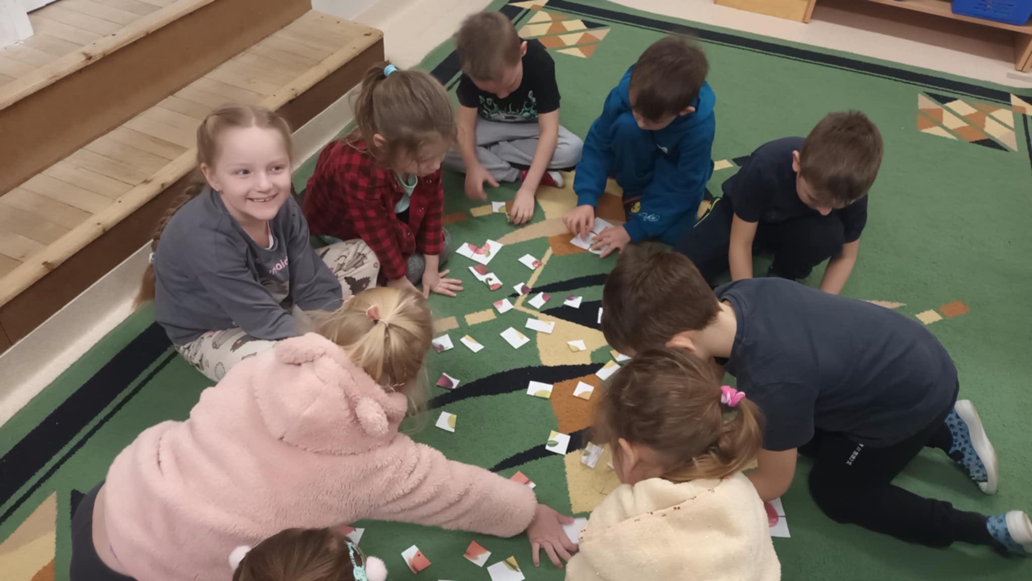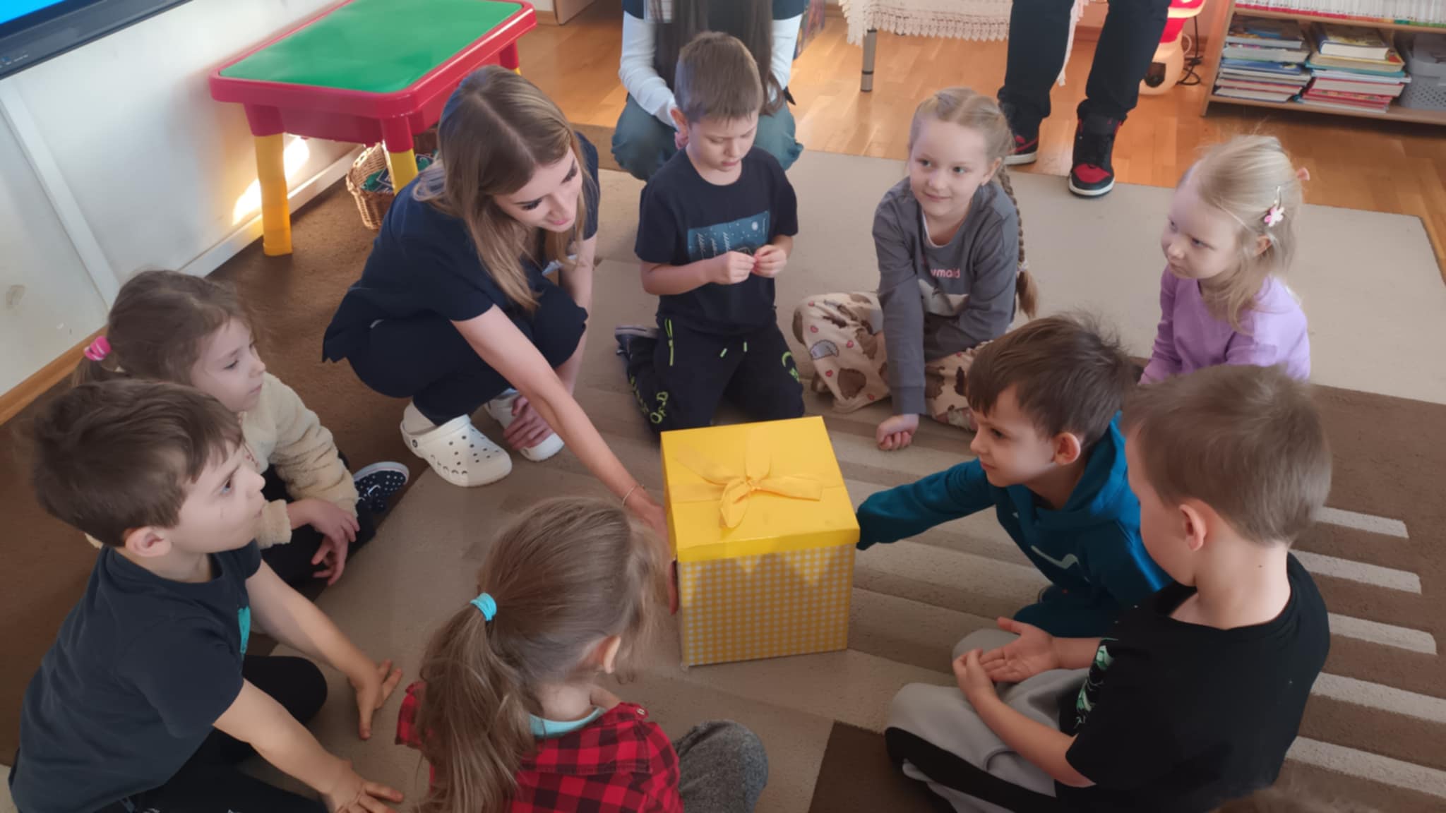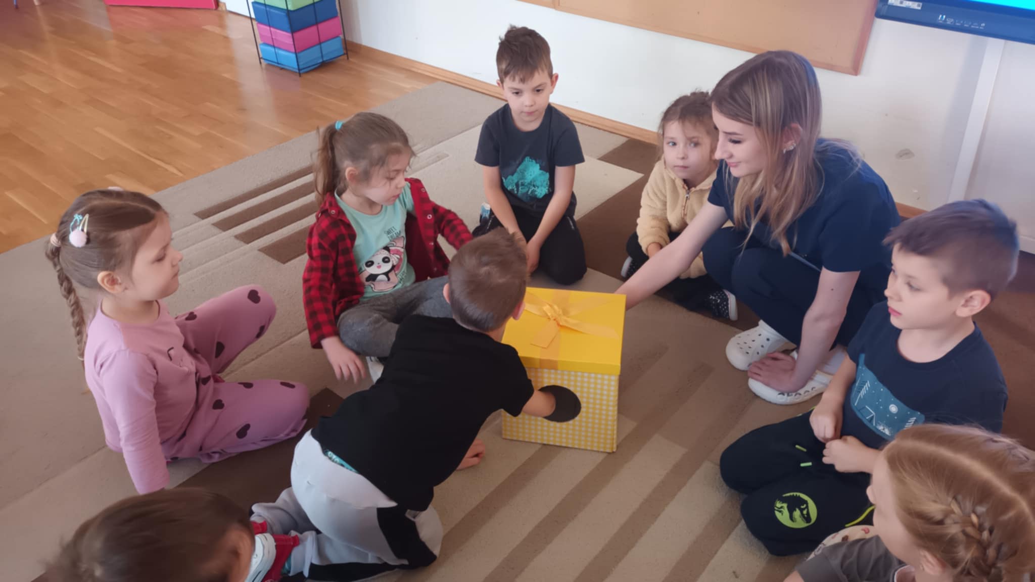 Grupa „Jabłcusie” gościła studentów I roku pielęgniarstwa z Państwowej Akademii Nauk Stosowanych im. Stefana Batorego w Skierniewicach. Przyszli medycy przeprowadzili dla naszych przedszkolaków ciekawe zajęcia pt. „Superbohaterowie na talerzu”. Podczas spotkania studenci wykorzystali prezentację multimedialną, aby w przystępny sposób opowiedzieć o roli witamin w życiu człowieka. Teoria przeplotła się z praktyką – dzięki licznym zabawom i wspólnym rozmowom, dzieci utrwaliły wiedzę o owocach i warzywach, ucząc się, jak dbać o zdrowie każdego dnia.