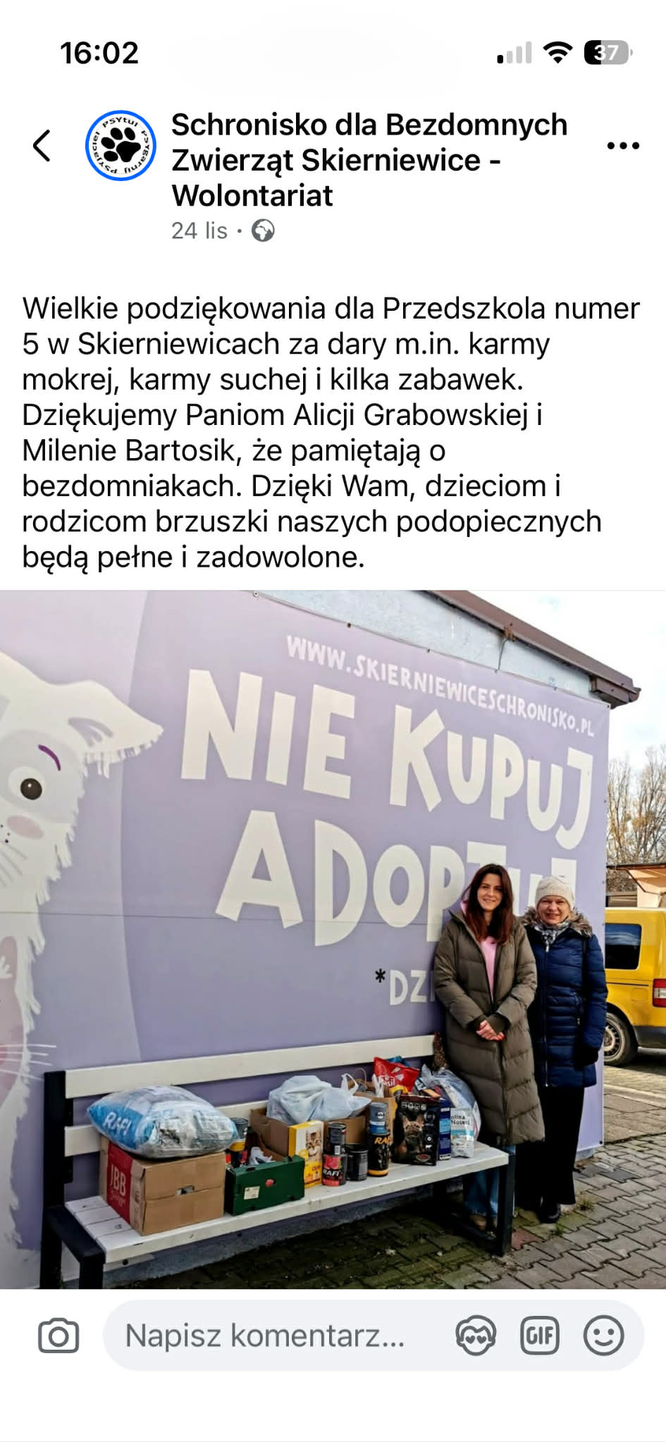Z radością informujemy, że zakończyliśmy akcję zbiórki darów pod nazwą „Rafi dla brzuszka – zimowa pomoc dla schroniska”. Odzew przeszedł nasze najśmielsze oczekiwania, a wszystkie zebrane dary zostały już przekazane podopiecznym schroniska w Skierniewicach. Serdecznie dziękujemy naszym przedszkolakom oraz ich rodzicom za tak ogromne zaangażowanie i każdą przekazaną rzecz. Dzięki Waszej hojności i otwartym sercom zwierzaki będą miały pełne brzuszki i znacznie łatwiej przetrwają nadchodzący zimowy czas. Jesteśmy dumni, że wspólnie możemy nieść pomoc potrzebującym czworonogom i uczyć najmłodszych empatii oraz wrażliwości na los zwierząt.