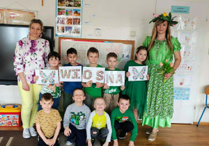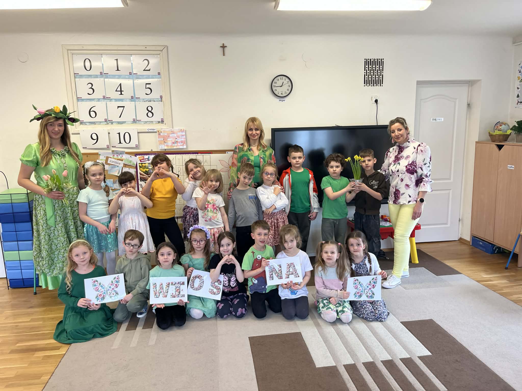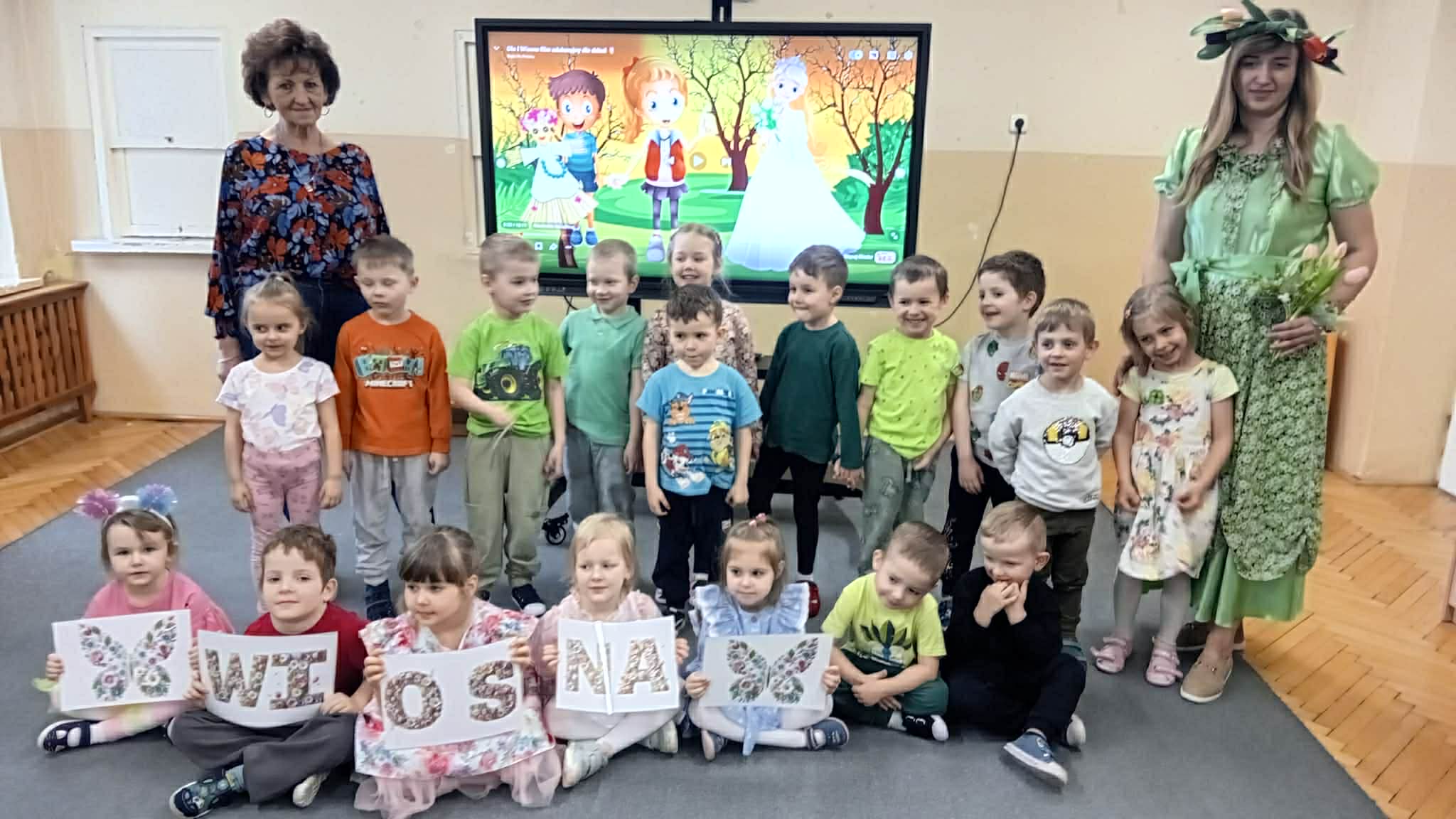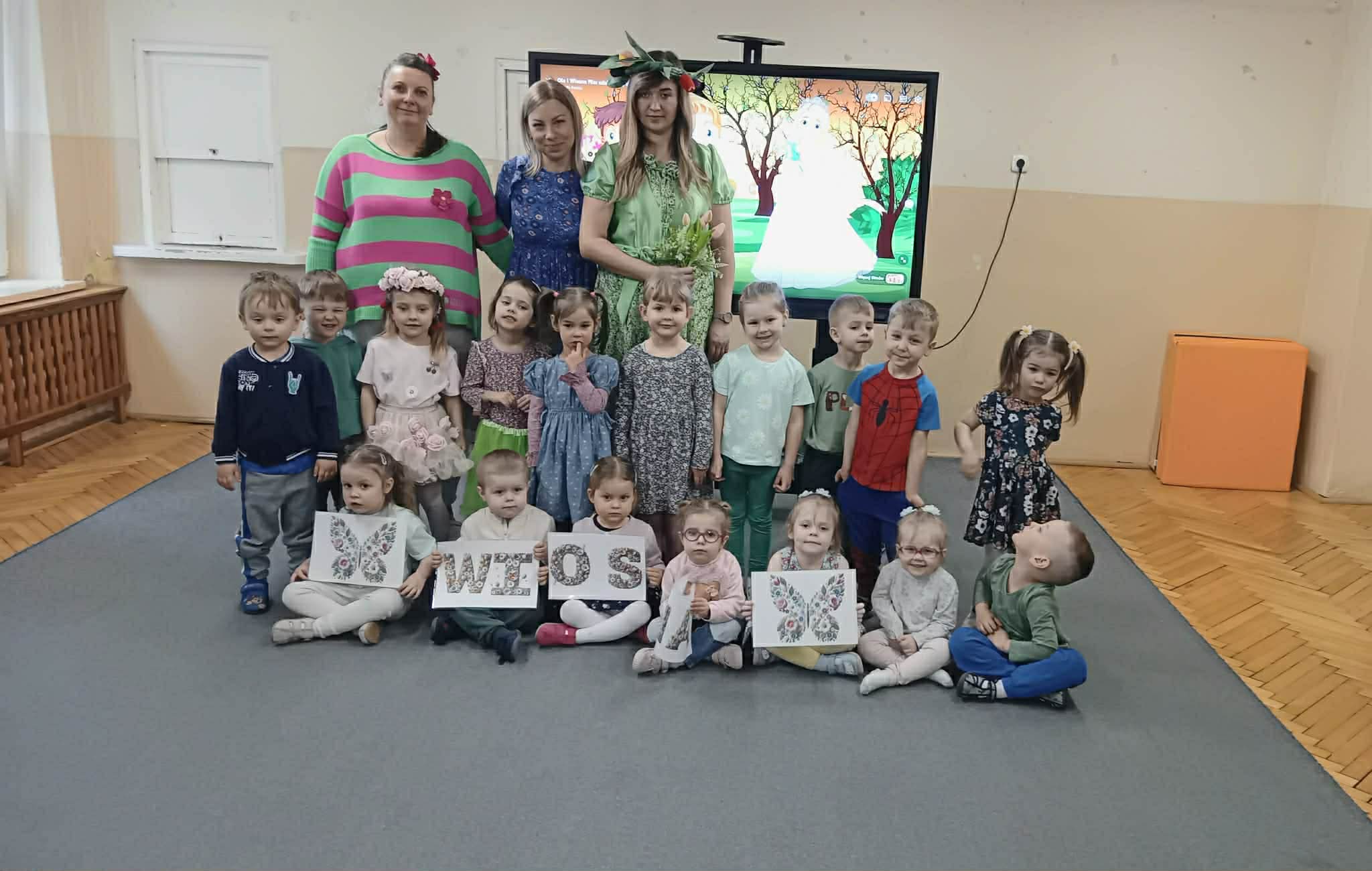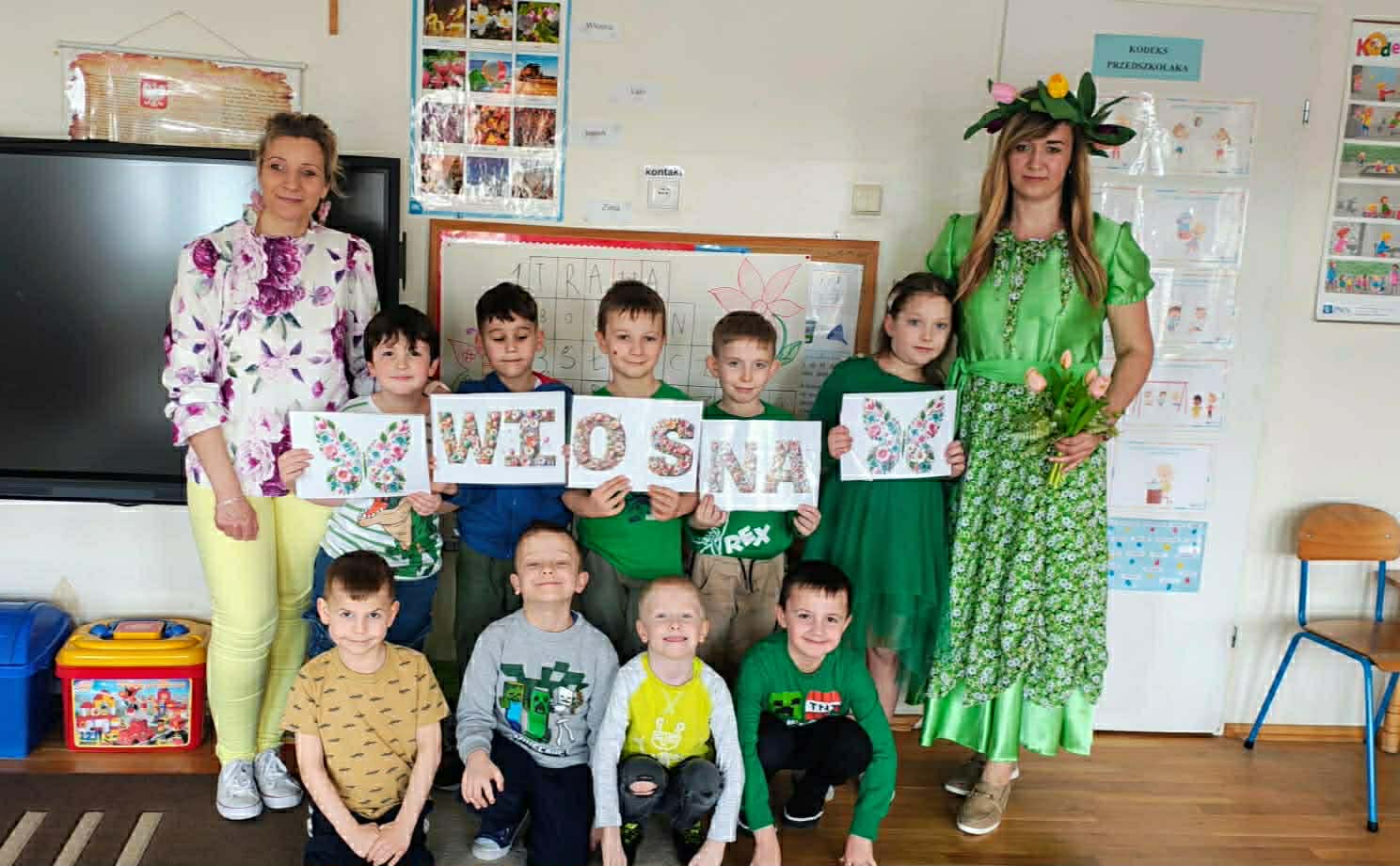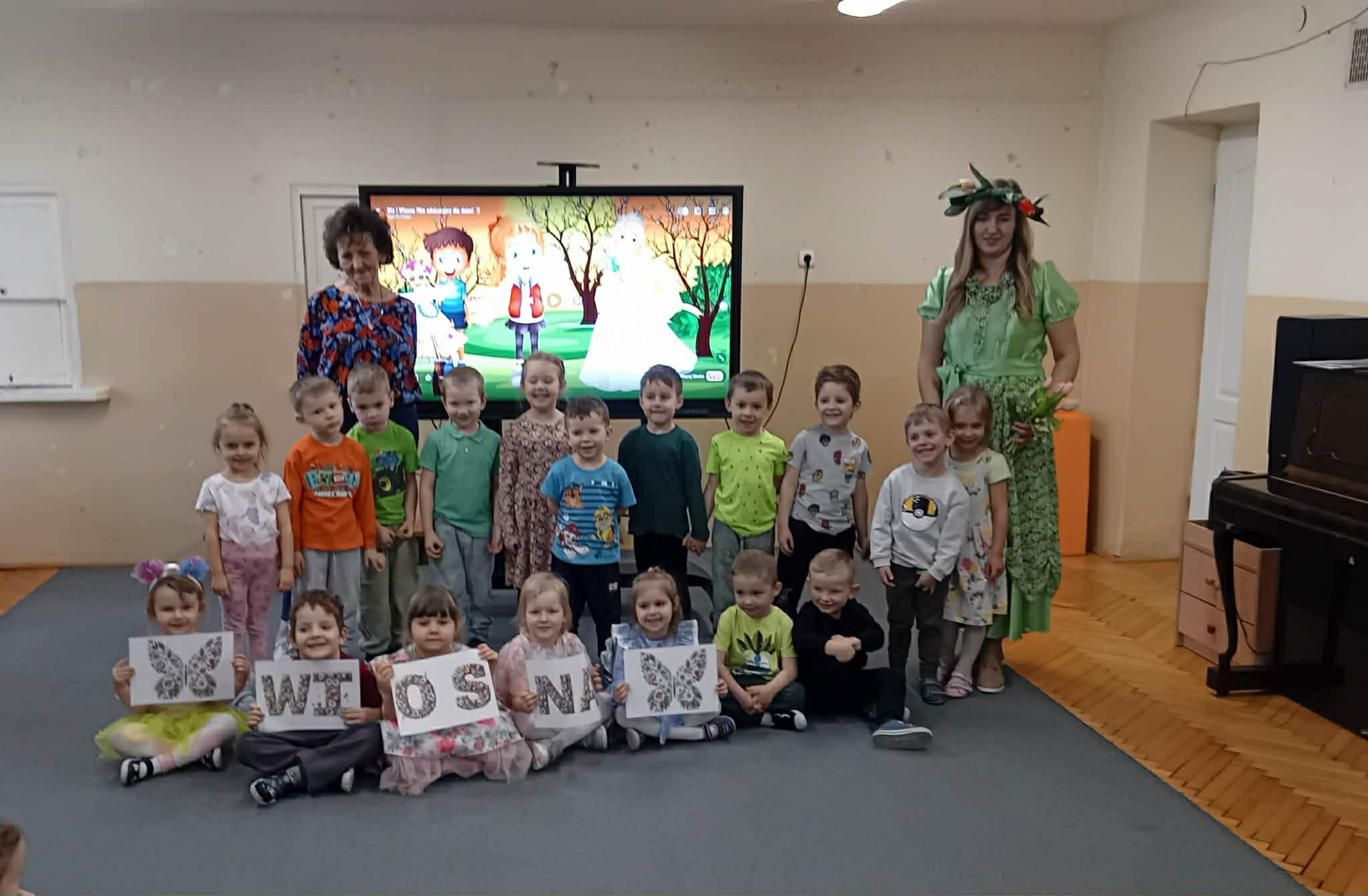 Dziś w naszym przedszkolu zrobiło się wyjątkowo zielono i radośnie – odwiedziła nas długo wyczekiwana Pani Wiosna! Choć za oknem bywa różnie, w naszych salach rozkwitły uśmiechy i zapanowała prawdziwie słoneczna atmosfera. Nasze najmłodsze przedszkolaki z grup „Bystrzaki” oraz „Biedronki” wspólnie świętowały ten dzień na sali gimnastycznej. Dzieci bawiły się wyśmienicie, wykazując się przy tym ogromną wiedzą – bezbłędnie odgadywały wiosenne zagadki! Nie zabrakło też radosnych śpiewów i tańców przy dźwiękach najpiękniejszych wiosennych piosenek. Na starsze grupy również czekała niezwykła wizyta Pani Wiosny. Dzieci z dumą prezentowały gościowi swoje talenty – recytowały wiersze i śpiewały piosenki o budzącej się do życia przyrodzie. Pani Wiosna przygotowała dla nich nie lada wyzwanie: wspólne rozwiązywanie krzyżówek! Starszaki poradziły sobie śpiewająco, wykazując się sprytem i wiedzą. Oczywiście nie obyło się bez radosnych, wspólnych zabaw ruchowych, które zintegrowały wszystkie dzieci. Na zakończenie spotkania każda grupa wykonała pamiątkowe zdjęcia z naszą wyjątkową towarzyszką. Dzieci z ogromnym entuzjazmem przyjęły Panią Wiosnę w naszych progach. Teraz wszyscy – mali i duzi – z niecierpliwością czekamy, aż pogoda za oknem również stanie się w pełni wiosenna!
