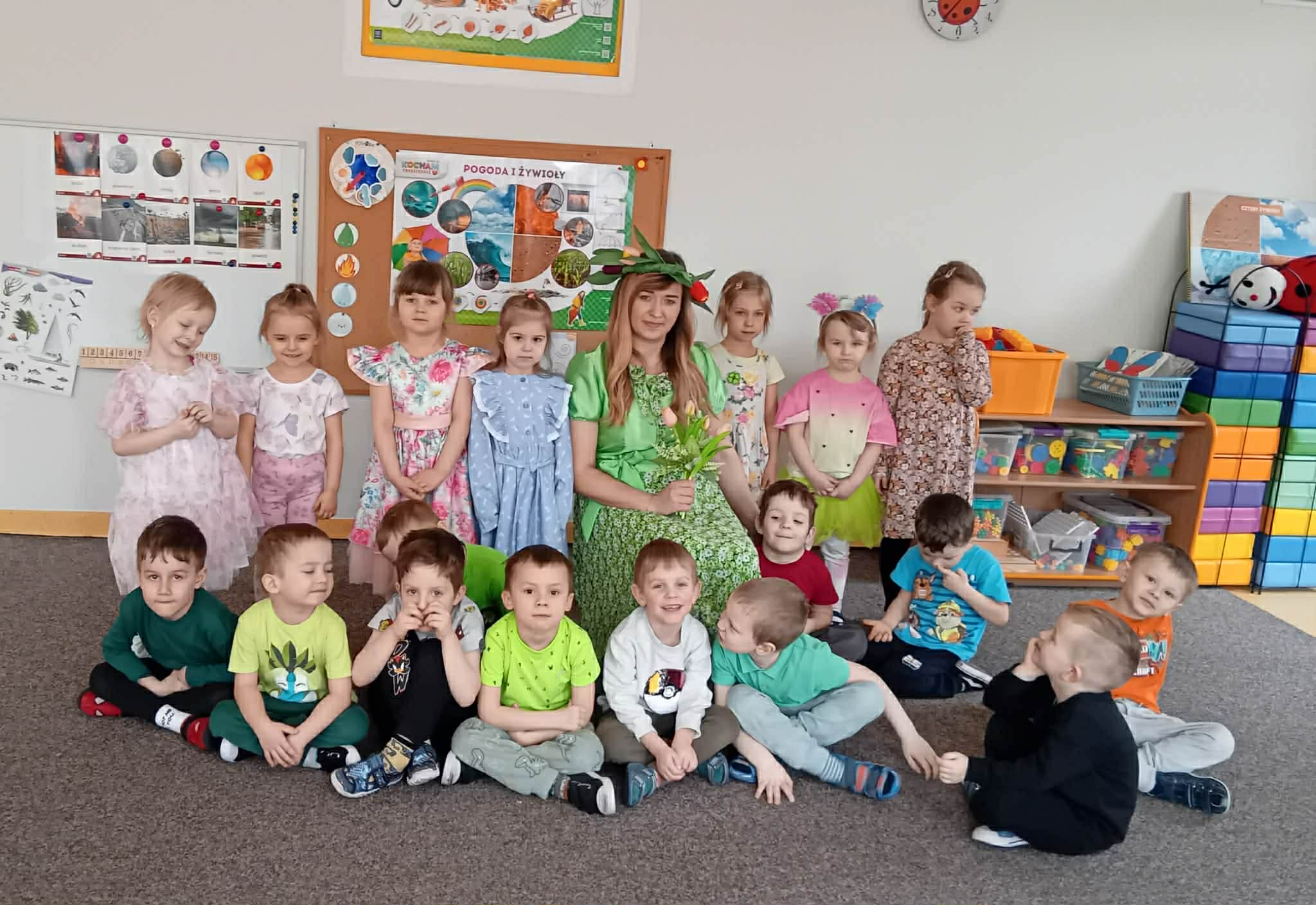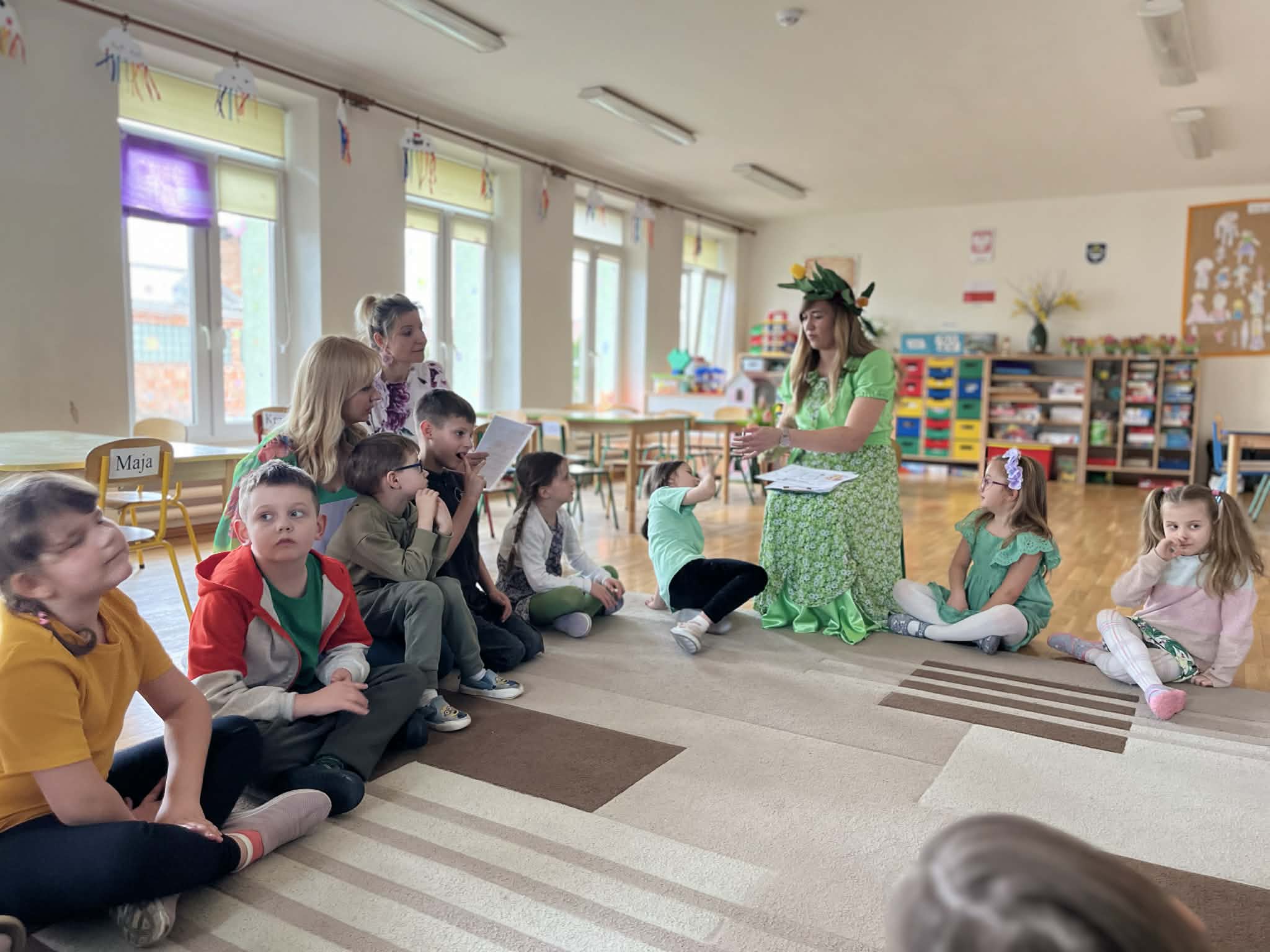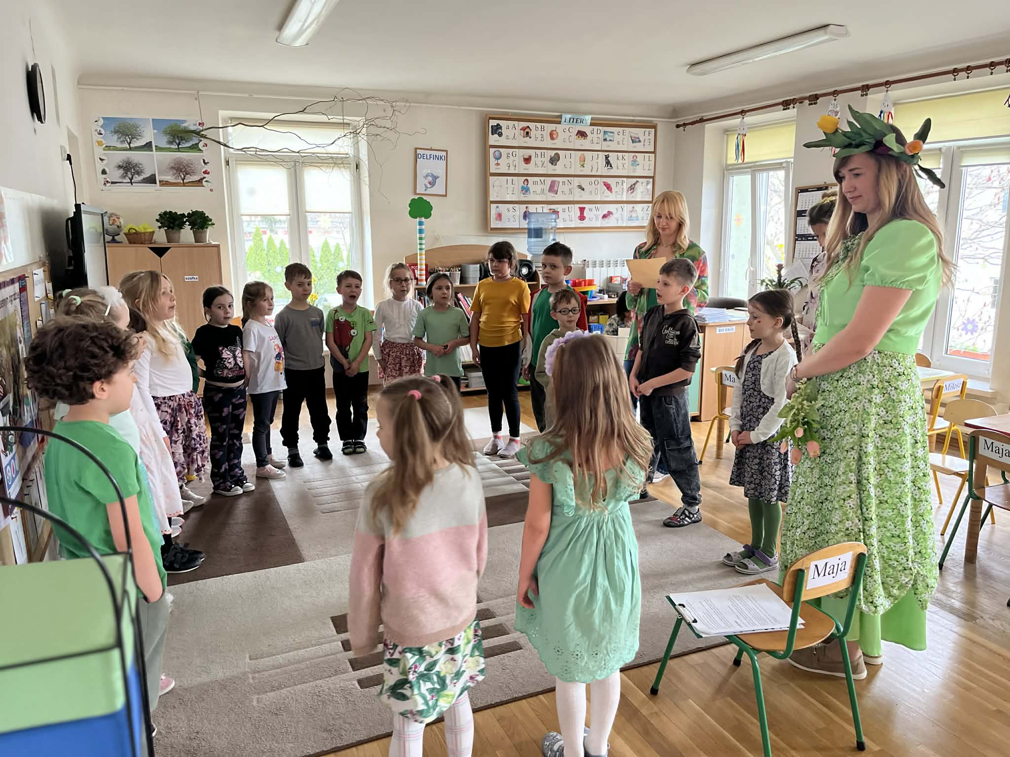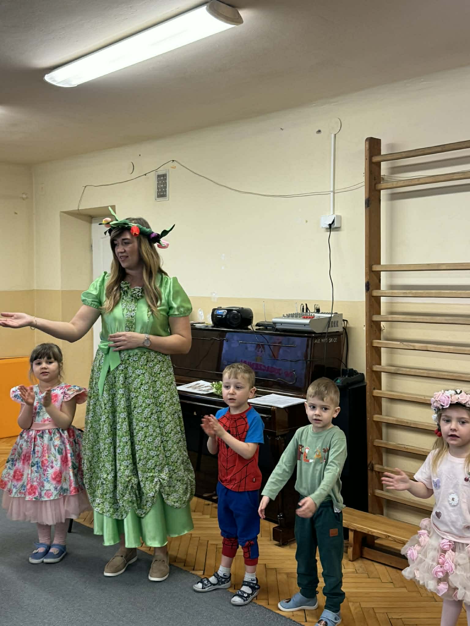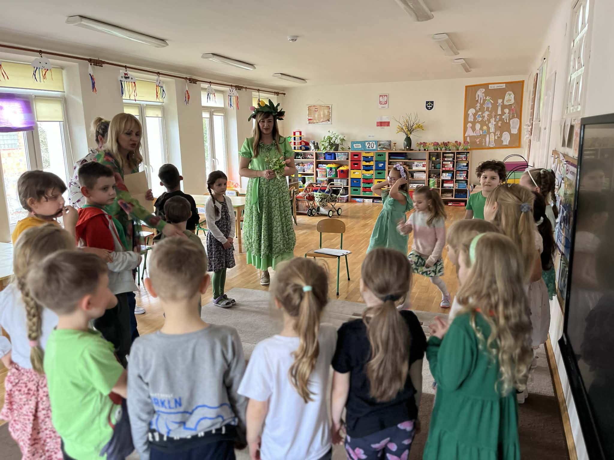 Dziś w naszym przedszkolu zrobiło się wyjątkowo zielono i radośnie – odwiedziła nas długo wyczekiwana Pani Wiosna! Choć za oknem bywa różnie, w naszych salach rozkwitły uśmiechy i zapanowała prawdziwie słoneczna atmosfera. Nasze najmłodsze przedszkolaki z grup „Bystrzaki” oraz „Biedronki” wspólnie świętowały ten dzień na sali gimnastycznej. Dzieci bawiły się wyśmienicie, wykazując się przy tym ogromną wiedzą – bezbłędnie odgadywały wiosenne zagadki! Nie zabrakło też radosnych śpiewów i tańców przy dźwiękach najpiękniejszych wiosennych piosenek. Na starsze grupy również czekała niezwykła wizyta Pani Wiosny. Dzieci z dumą prezentowały gościowi swoje talenty – recytowały wiersze i śpiewały piosenki o budzącej się do życia przyrodzie. Pani Wiosna przygotowała dla nich nie lada wyzwanie: wspólne rozwiązywanie krzyżówek! Starszaki poradziły sobie śpiewająco, wykazując się sprytem i wiedzą. Oczywiście nie obyło się bez radosnych, wspólnych zabaw ruchowych, które zintegrowały wszystkie dzieci. Na zakończenie spotkania każda grupa wykonała pamiątkowe zdjęcia z naszą wyjątkową towarzyszką. Dzieci z ogromnym entuzjazmem przyjęły Panią Wiosnę w naszych progach. Teraz wszyscy – mali i duzi – z niecierpliwością czekamy, aż pogoda za oknem również stanie się w pełni wiosenna!