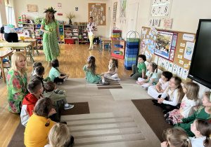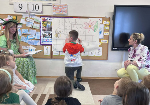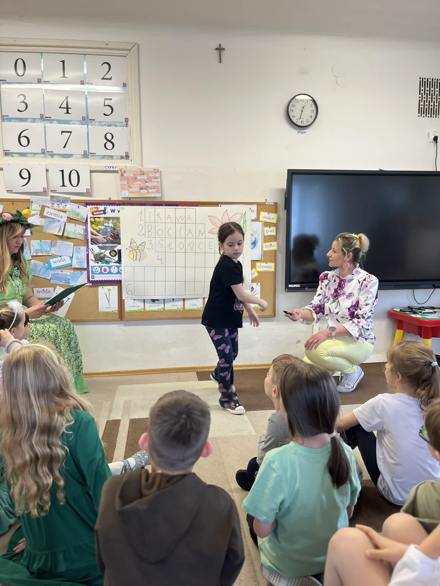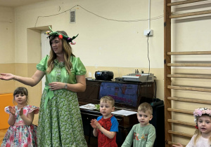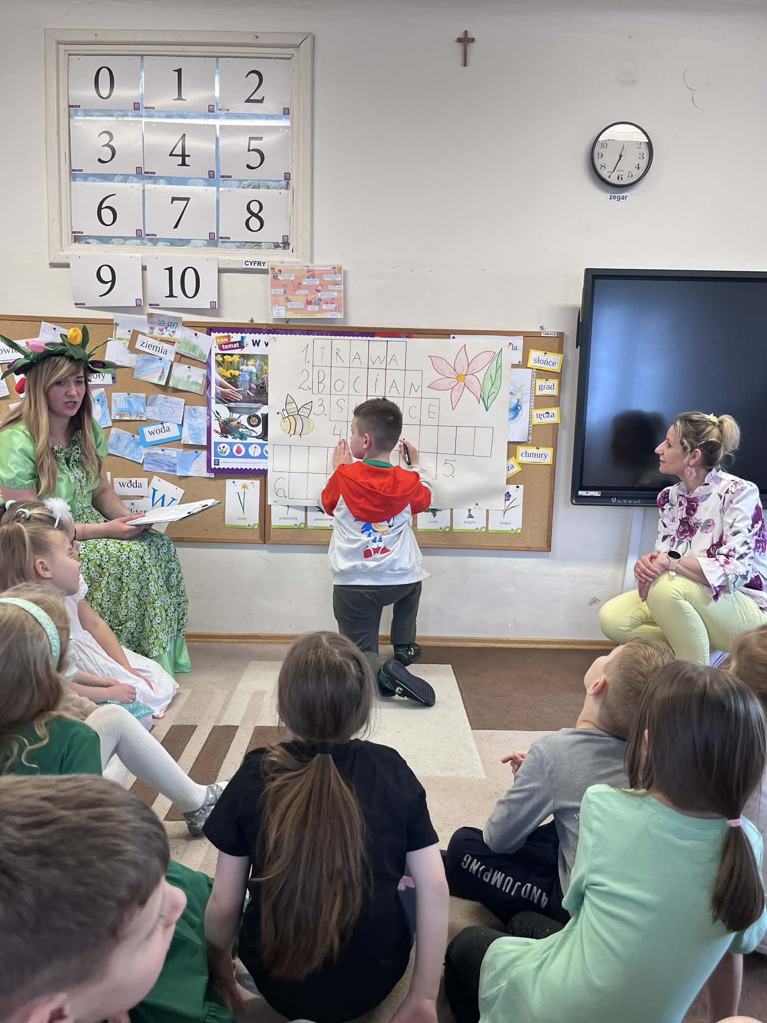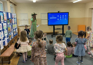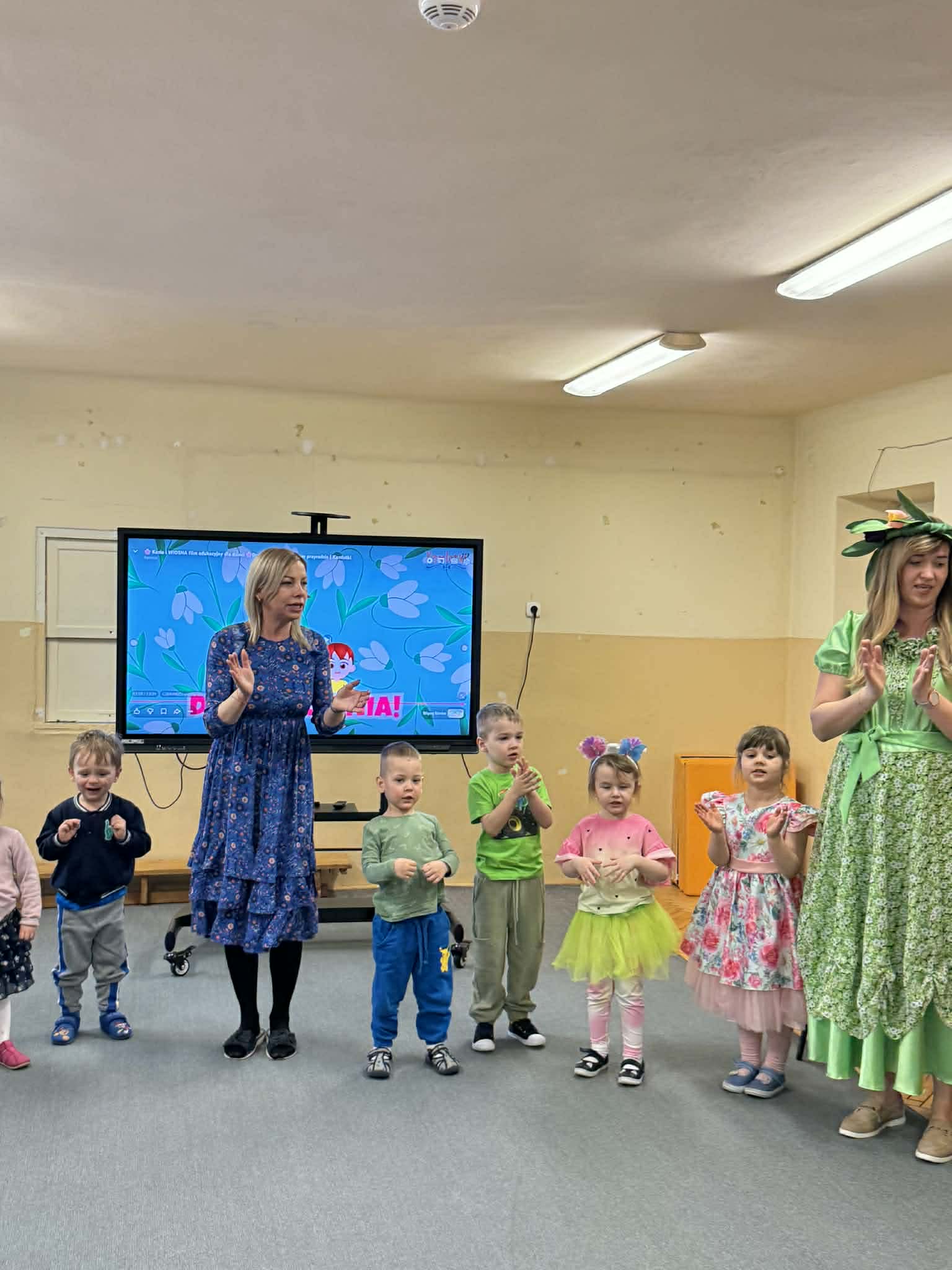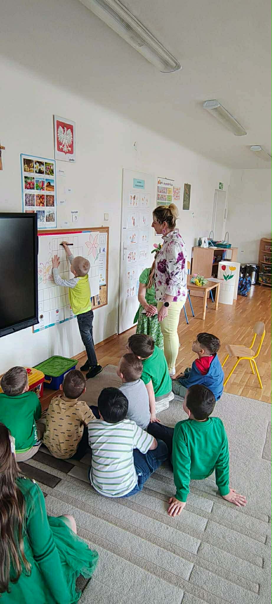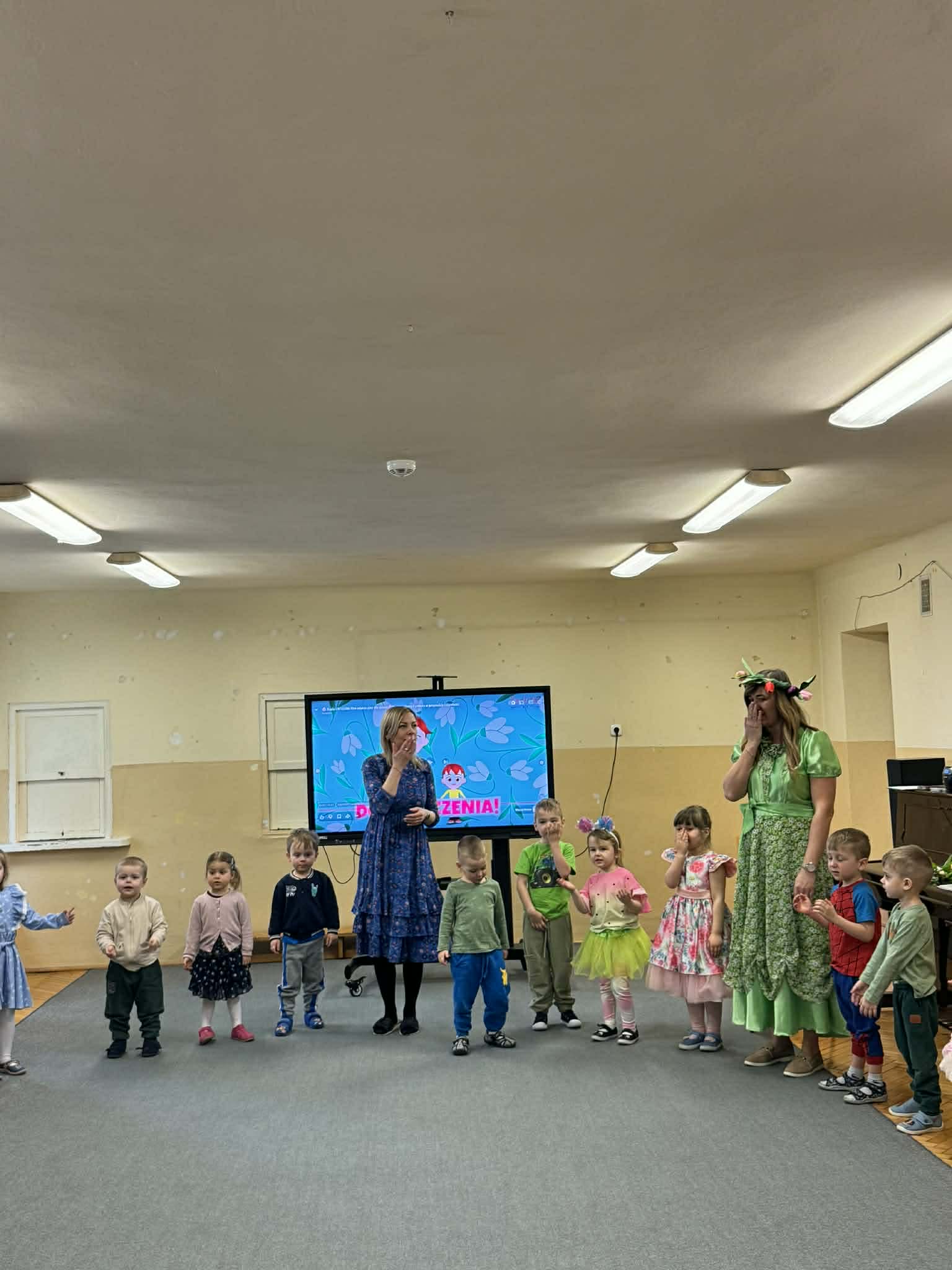 Dziś w naszym przedszkolu zrobiło się wyjątkowo zielono i radośnie – odwiedziła nas długo wyczekiwana Pani Wiosna! Choć za oknem bywa różnie, w naszych salach rozkwitły uśmiechy i zapanowała prawdziwie słoneczna atmosfera. Nasze najmłodsze przedszkolaki z grup „Bystrzaki” oraz „Biedronki” wspólnie świętowały ten dzień na sali gimnastycznej. Dzieci bawiły się wyśmienicie, wykazując się przy tym ogromną wiedzą – bezbłędnie odgadywały wiosenne zagadki! Nie zabrakło też radosnych śpiewów i tańców przy dźwiękach najpiękniejszych wiosennych piosenek. Na starsze grupy również czekała niezwykła wizyta Pani Wiosny. Dzieci z dumą prezentowały gościowi swoje talenty – recytowały wiersze i śpiewały piosenki o budzącej się do życia przyrodzie. Pani Wiosna przygotowała dla nich nie lada wyzwanie: wspólne rozwiązywanie krzyżówek! Starszaki poradziły sobie śpiewająco, wykazując się sprytem i wiedzą. Oczywiście nie obyło się bez radosnych, wspólnych zabaw ruchowych, które zintegrowały wszystkie dzieci. Na zakończenie spotkania każda grupa wykonała pamiątkowe zdjęcia z naszą wyjątkową towarzyszką. Dzieci z ogromnym entuzjazmem przyjęły Panią Wiosnę w naszych progach. Teraz wszyscy – mali i duzi – z niecierpliwością czekamy, aż pogoda za oknem również stanie się w pełni wiosenna!