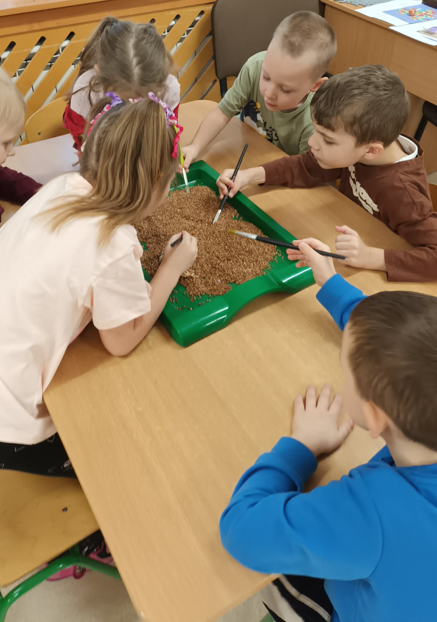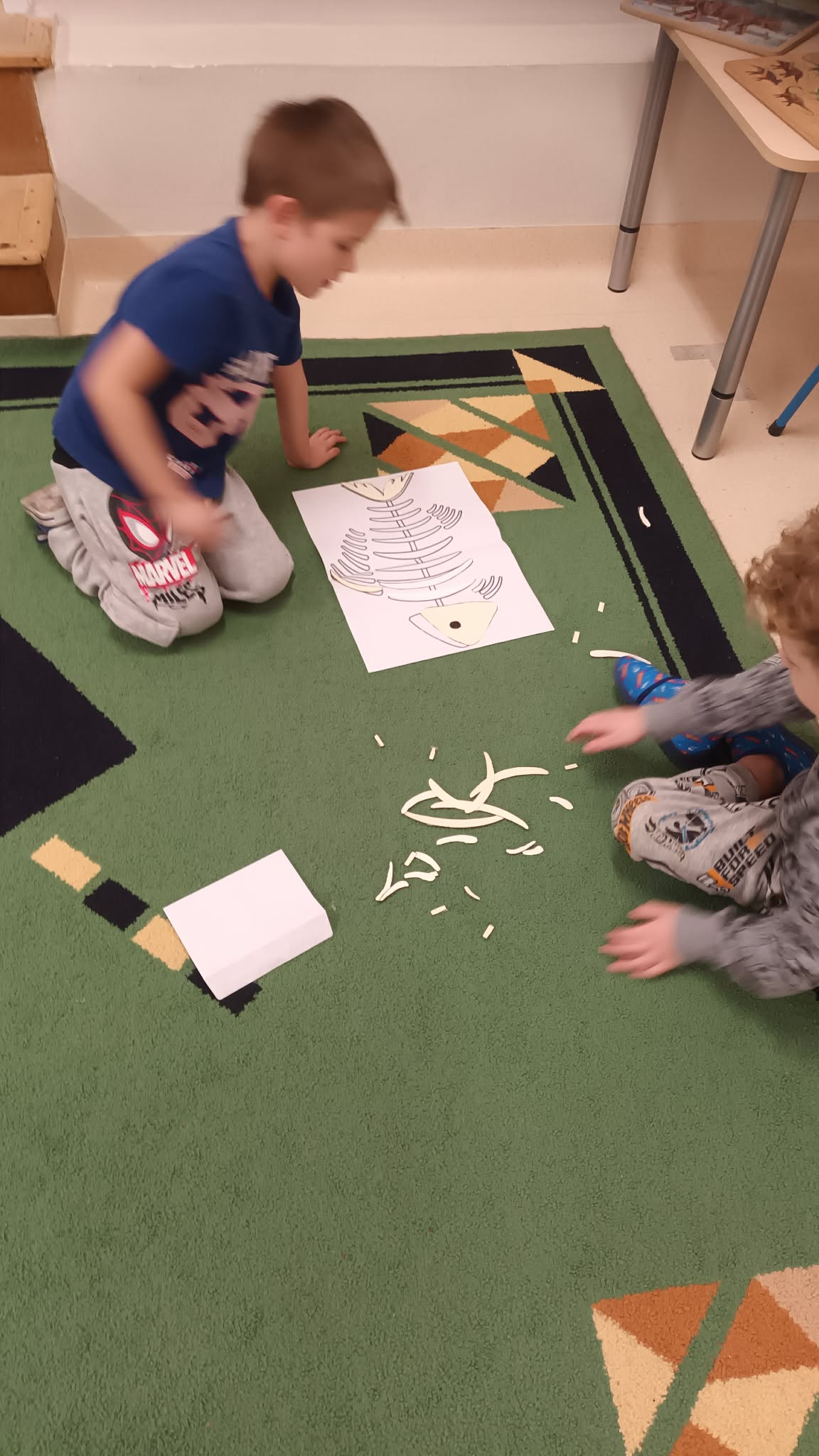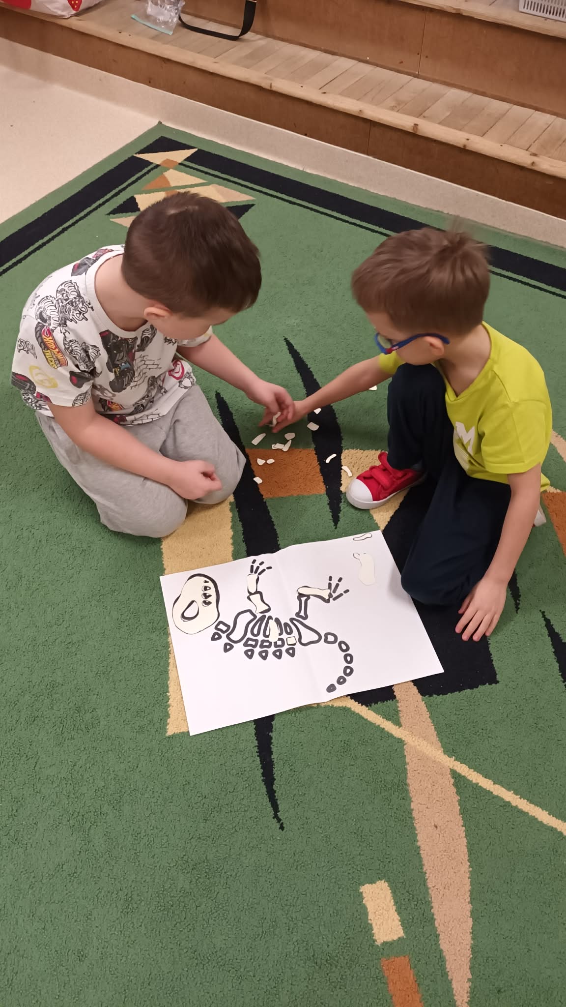Nasza sala zamieniła się dziś w prawdziwy teren wykopalisk! Podczas zajęć sensorycznych dzieci wcieliły się w rolę paleontologów, odkrywając tajemnice prehistorycznego świata. Głównym zadaniem było odszukiwanie ukrytych szczątków dinozaurów, które „zaginęły” w wielkich misach wypełnionych kaszą gryczaną oraz kaszą manną. Przesypywanie ziaren, dotykanie różnych struktur i precyzyjne poszukiwania były doskonałym ćwiczeniem dla małych rączek i zmysłów. Po udanych wykopaliskach nasi badacze z wielkim skupieniem przystąpili do układania szkieletów prehistorycznych zwierząt, dopasowując odnalezione elementy w całość. Ta pełna emocji zabawa nie tylko pobudziła wyobraźnię, ale też rozwinęła sprawność manualną i cierpliwość naszych małych odkrywców