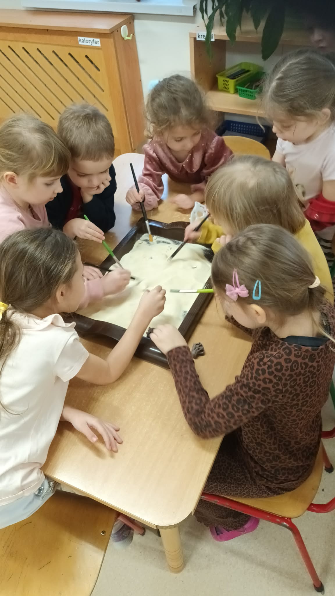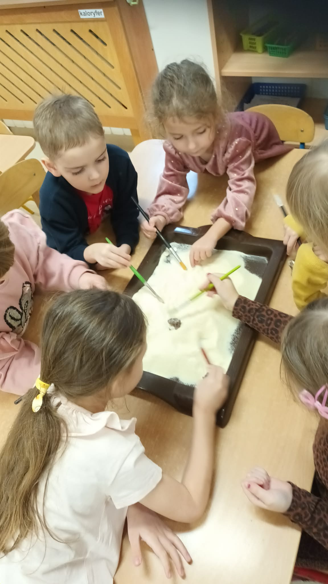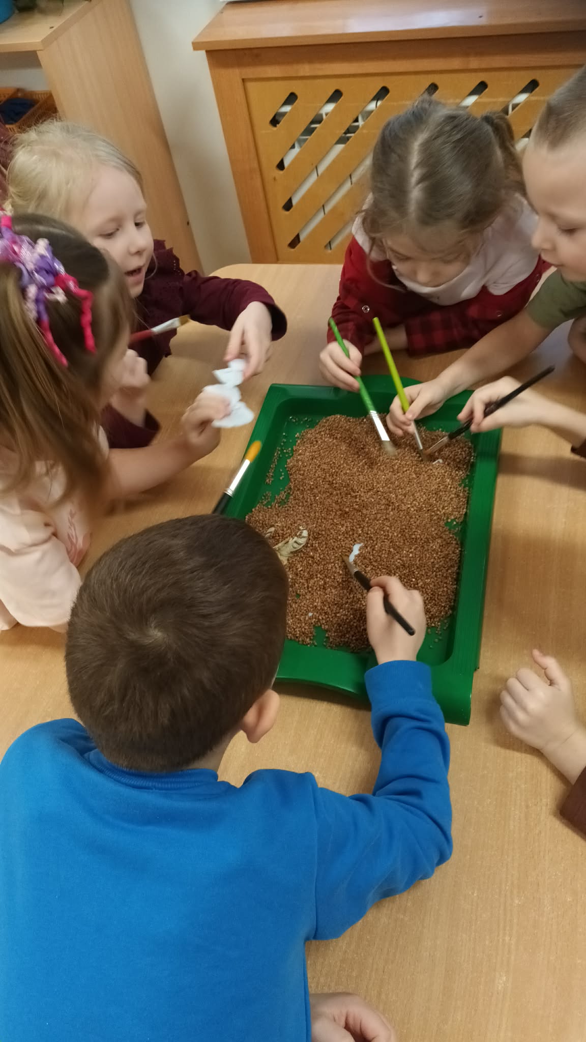 Nasza sala zamieniła się dziś w prawdziwy teren wykopalisk! Podczas zajęć sensorycznych dzieci wcieliły się w rolę paleontologów, odkrywając tajemnice prehistorycznego świata. Głównym zadaniem było odszukiwanie ukrytych szczątków dinozaurów, które „zaginęły” w wielkich misach wypełnionych kaszą gryczaną oraz kaszą manną. Przesypywanie ziaren, dotykanie różnych struktur i precyzyjne poszukiwania były doskonałym ćwiczeniem dla małych rączek i zmysłów. Po udanych wykopaliskach nasi badacze z wielkim skupieniem przystąpili do układania szkieletów prehistorycznych zwierząt, dopasowując odnalezione elementy w całość. Ta pełna emocji zabawa nie tylko pobudziła wyobraźnię, ale też rozwinęła sprawność manualną i cierpliwość naszych małych odkrywców
