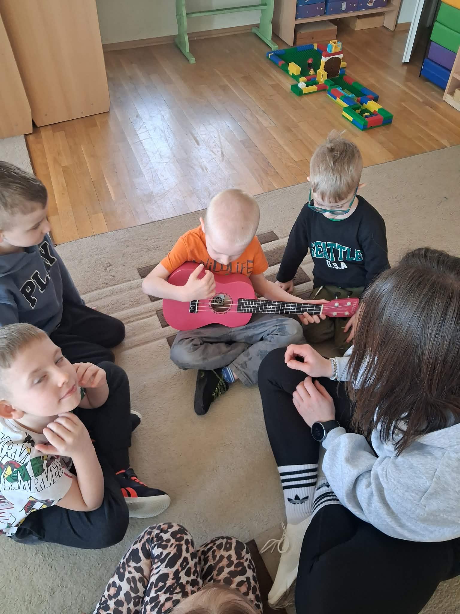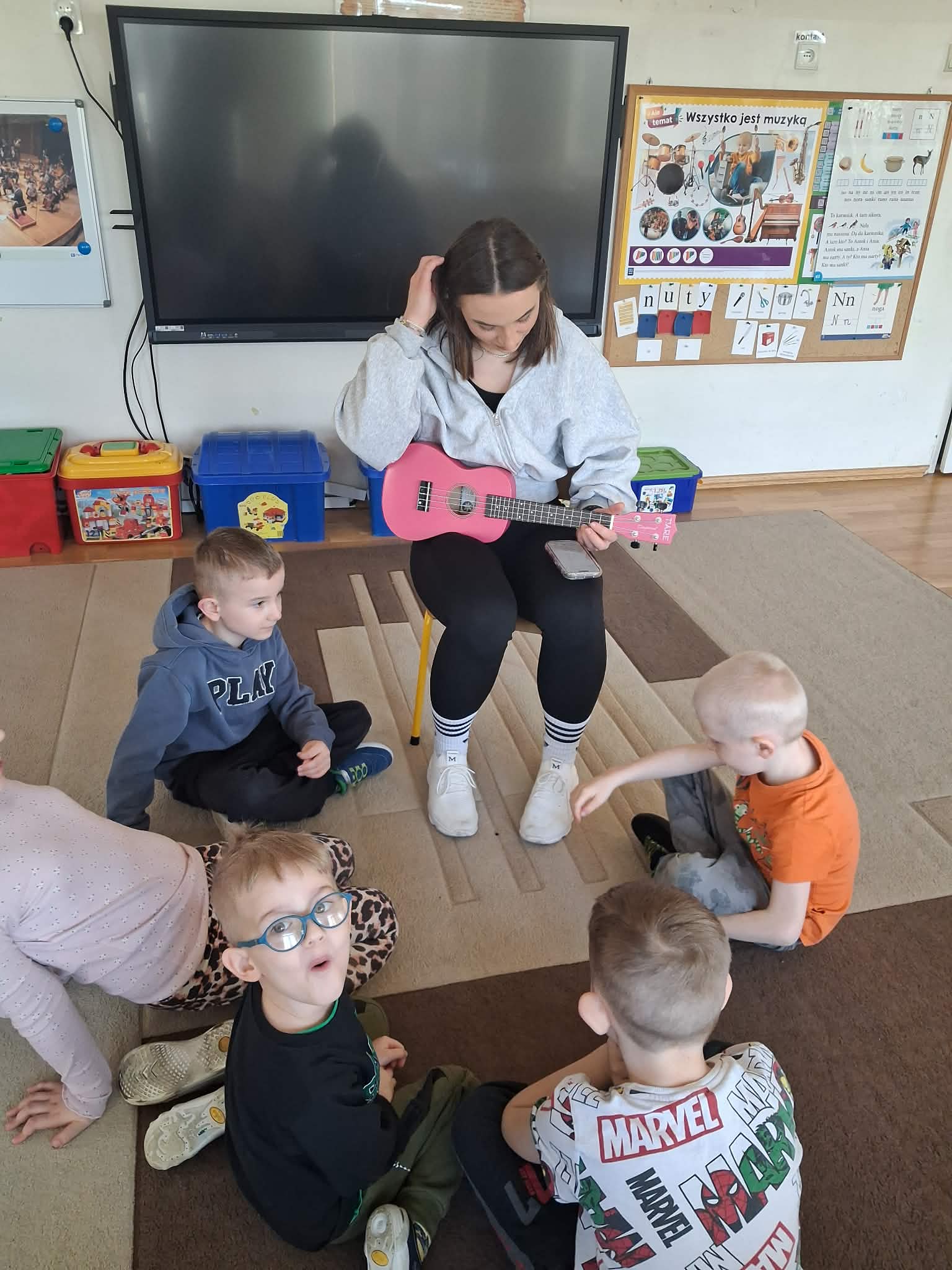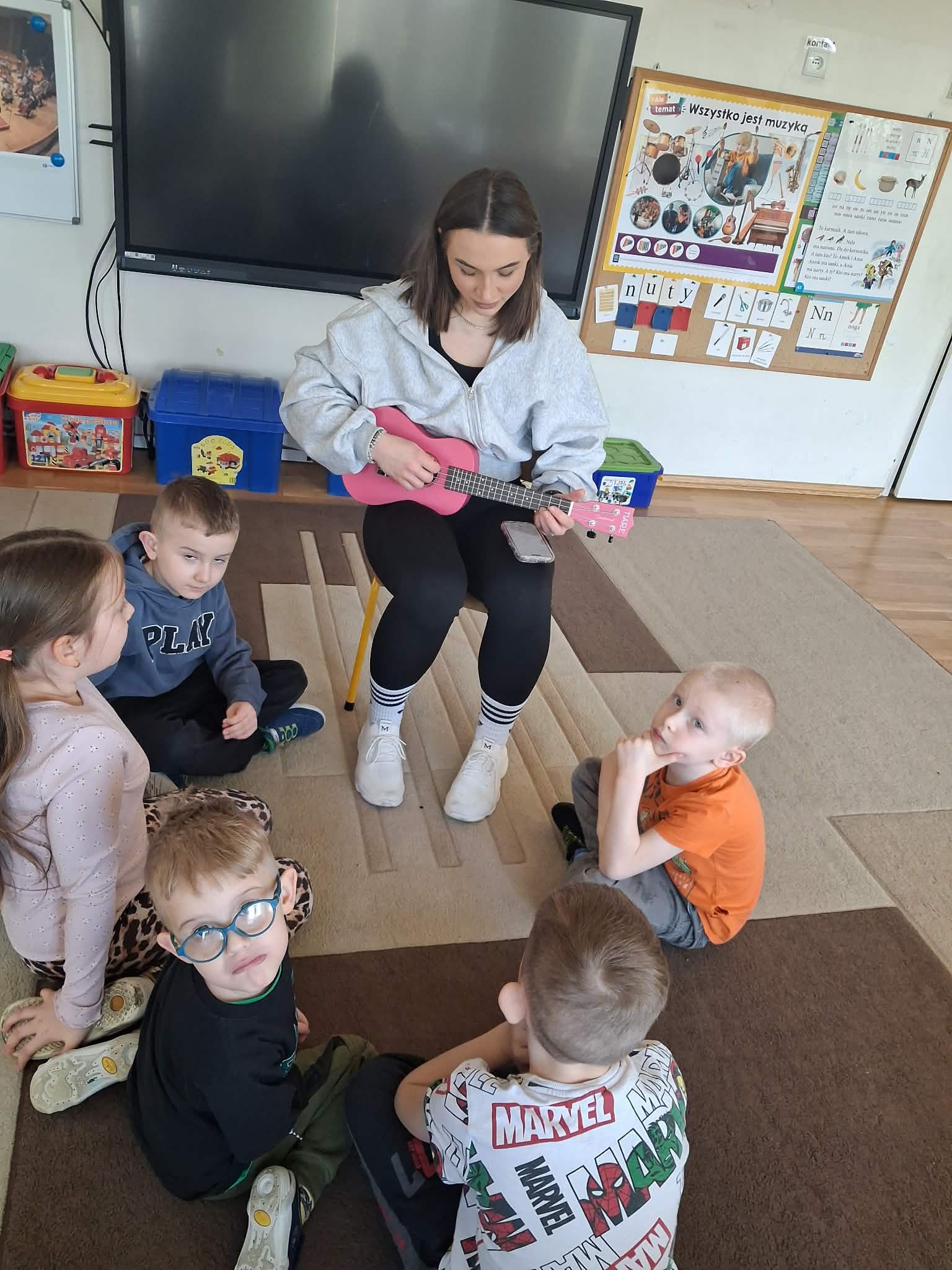 W naszej grupie „Wiewiórki” odbyły się wyjątkowe zajęcia muzyczne. Pani Julia przyniosła ze sobą ukulele i opowiedziała dzieciom o tym instrumencie. Przedszkolaki miały okazję posłuchać, jak brzmi ukulele oraz zobaczyć, w jaki sposób się na nim gra. Podczas zajęć dzieci z dużym zainteresowaniem słuchały muzyki, a także mogły spróbować swoich sił, delikatnie dotykając strun i poznając podstawy gry. Było to bardzo radosne i inspirujące spotkanie z muzyką, które sprawiło dzieciom wiele radości.