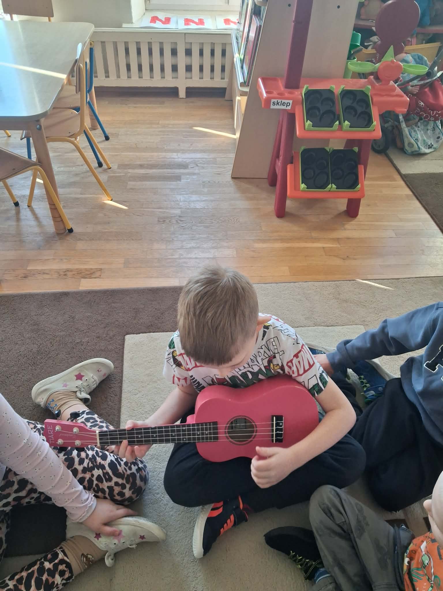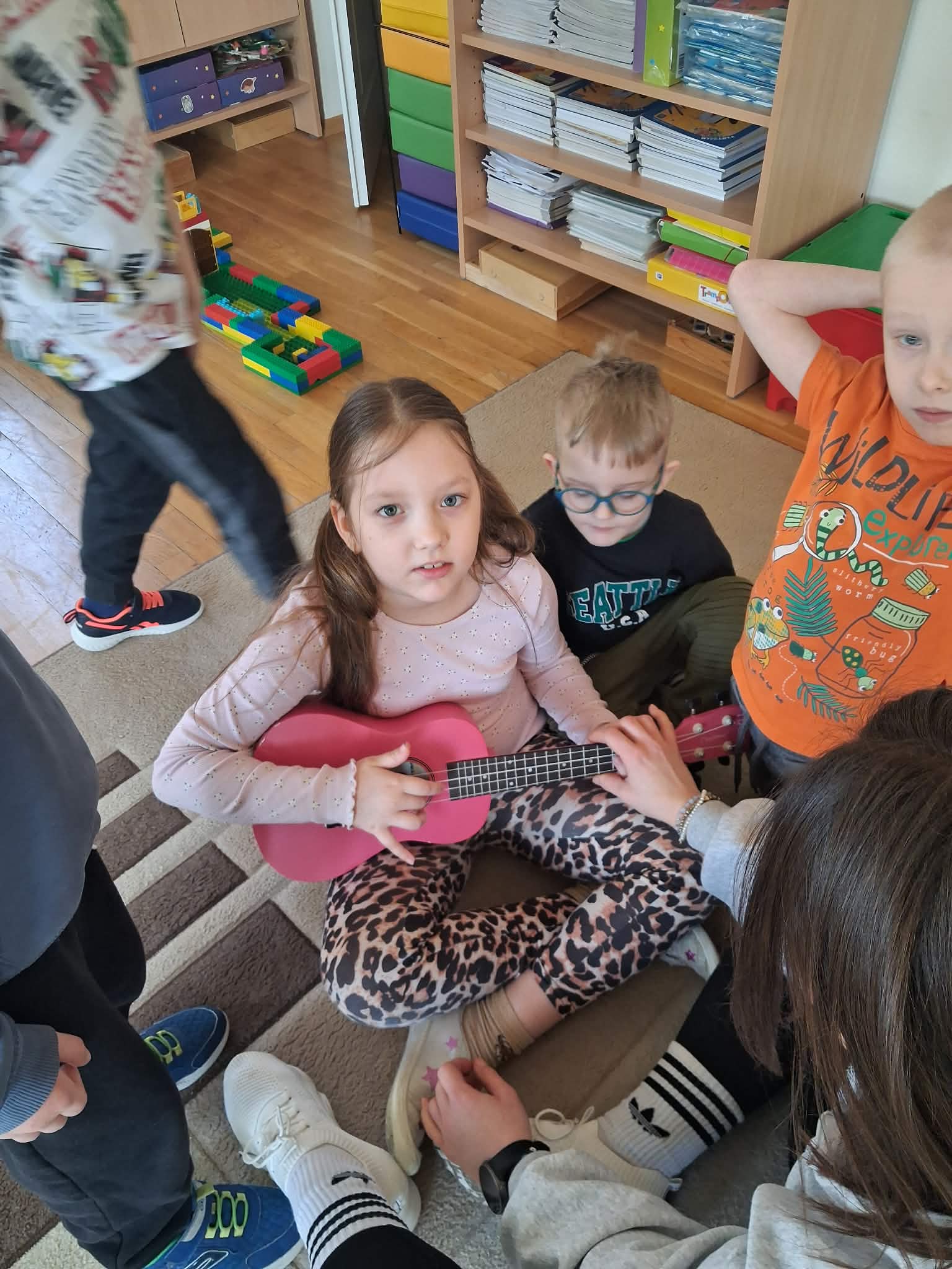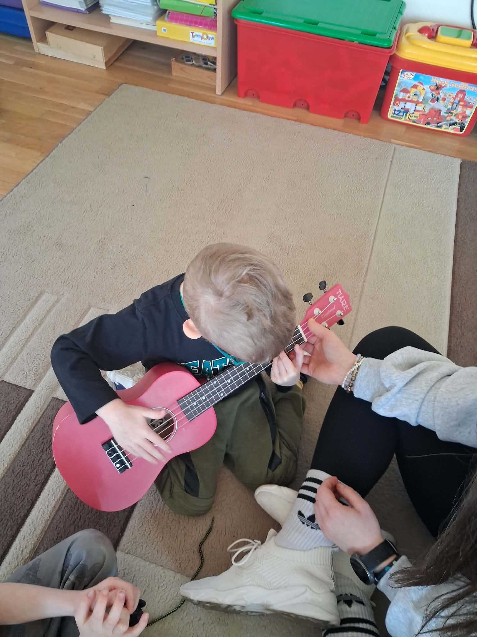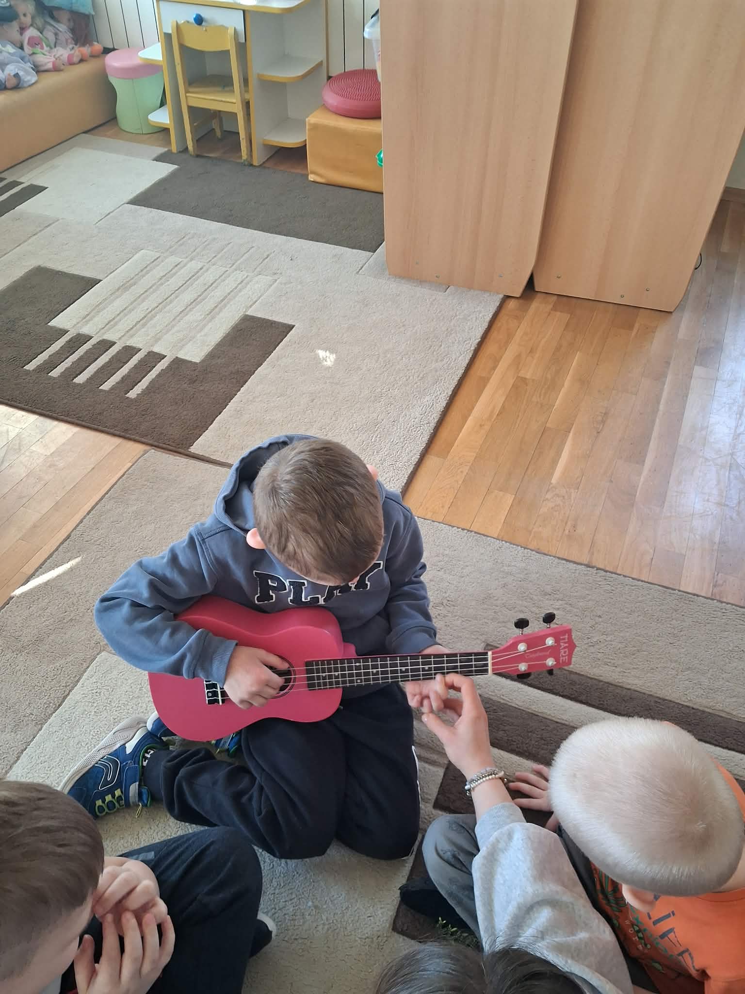 W naszej grupie „Wiewiórki” odbyły się wyjątkowe zajęcia muzyczne. Pani Julia przyniosła ze sobą ukulele i opowiedziała dzieciom o tym instrumencie. Przedszkolaki miały okazję posłuchać, jak brzmi ukulele oraz zobaczyć, w jaki sposób się na nim gra. Podczas zajęć dzieci z dużym zainteresowaniem słuchały muzyki, a także mogły spróbować swoich sił, delikatnie dotykając strun i poznając podstawy gry. Było to bardzo radosne i inspirujące spotkanie z muzyką, które sprawiło dzieciom wiele radości.